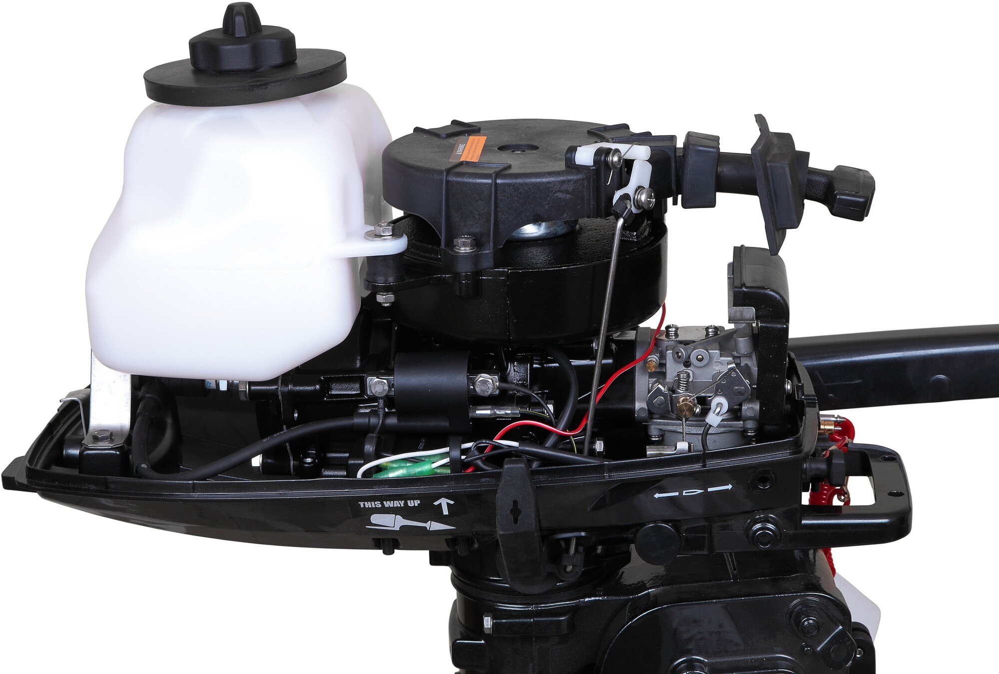 | Дополнительная информация | дополнительный выносной топливный бак 12 л; степень сжатия 6.5; система смазки - Премикс; пропорция топливно-масляной смеси - 50:1; топливный коннектор и тросовый талреп для остановки двигателя; ограничитель частоты вращения: передвижение по мелководью; приводное зацепление гребного винта - шлицевое соединение; система выпуска отработанных газов - над гребным винтом; редуктор: 2.08 x; система подачи топлива: карбюратор; передача: вперед-нейтраль-назад; топливный бак: встроенный; тип смазки: смесь; ход поршня: 43 мм; максимальные обороты двигателя: 5500 об/мин; диаметр цилиндра: 55 мм |