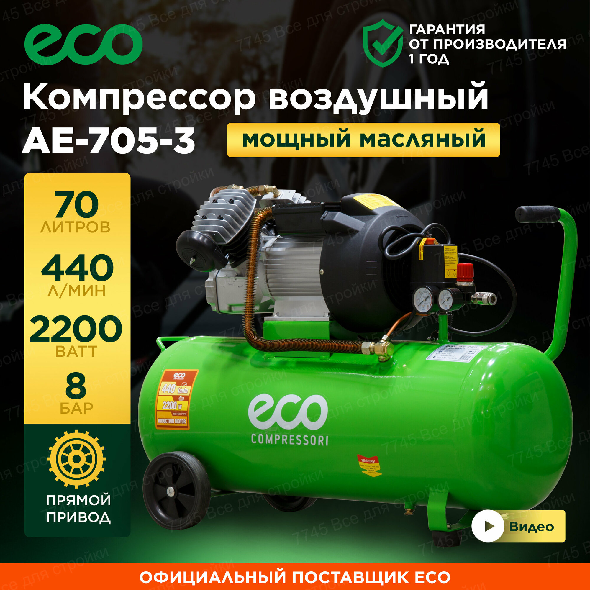 Компрессор воздушный масляный ECO AE-705-3 (440 л/мин, 8 атм, коаксиальный, ресивер 70 л, 220 В, 2.20 кВт) (AE-705-3)