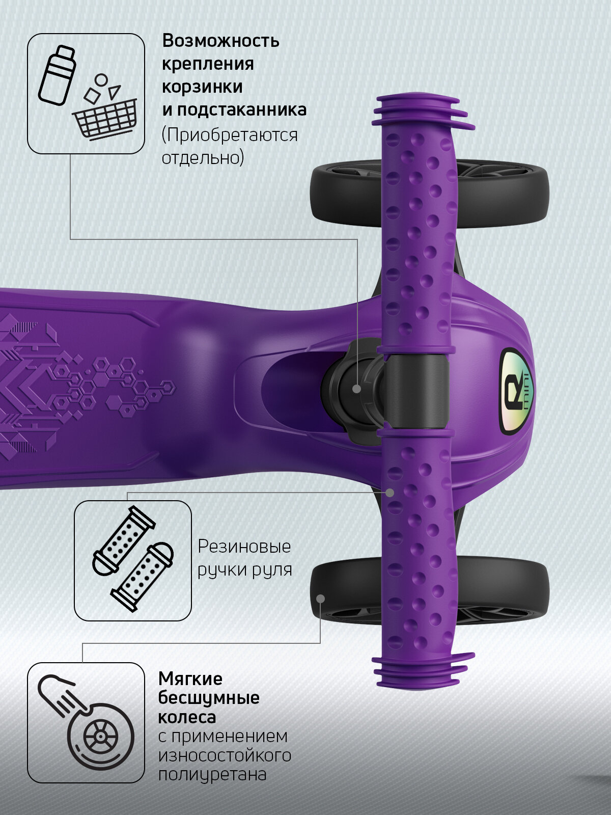 Cамокат трехколесный детский BuggyBoom Alfa Mini R с корзинкой и подстаканником для бутылок, фиолетовый 004-2065