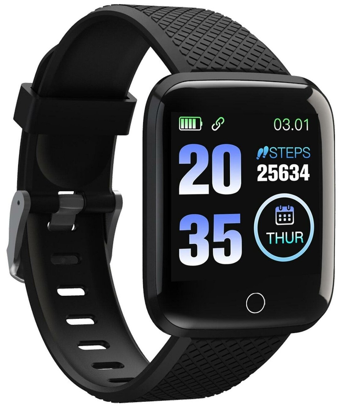 | Плюсы: | Полноценные часы, отображают дата, время, батарею, шаги, все необходимые функции для быстрого просмотра не касаясь телефона, вот детально уже можно все увидеть в приложении. |
