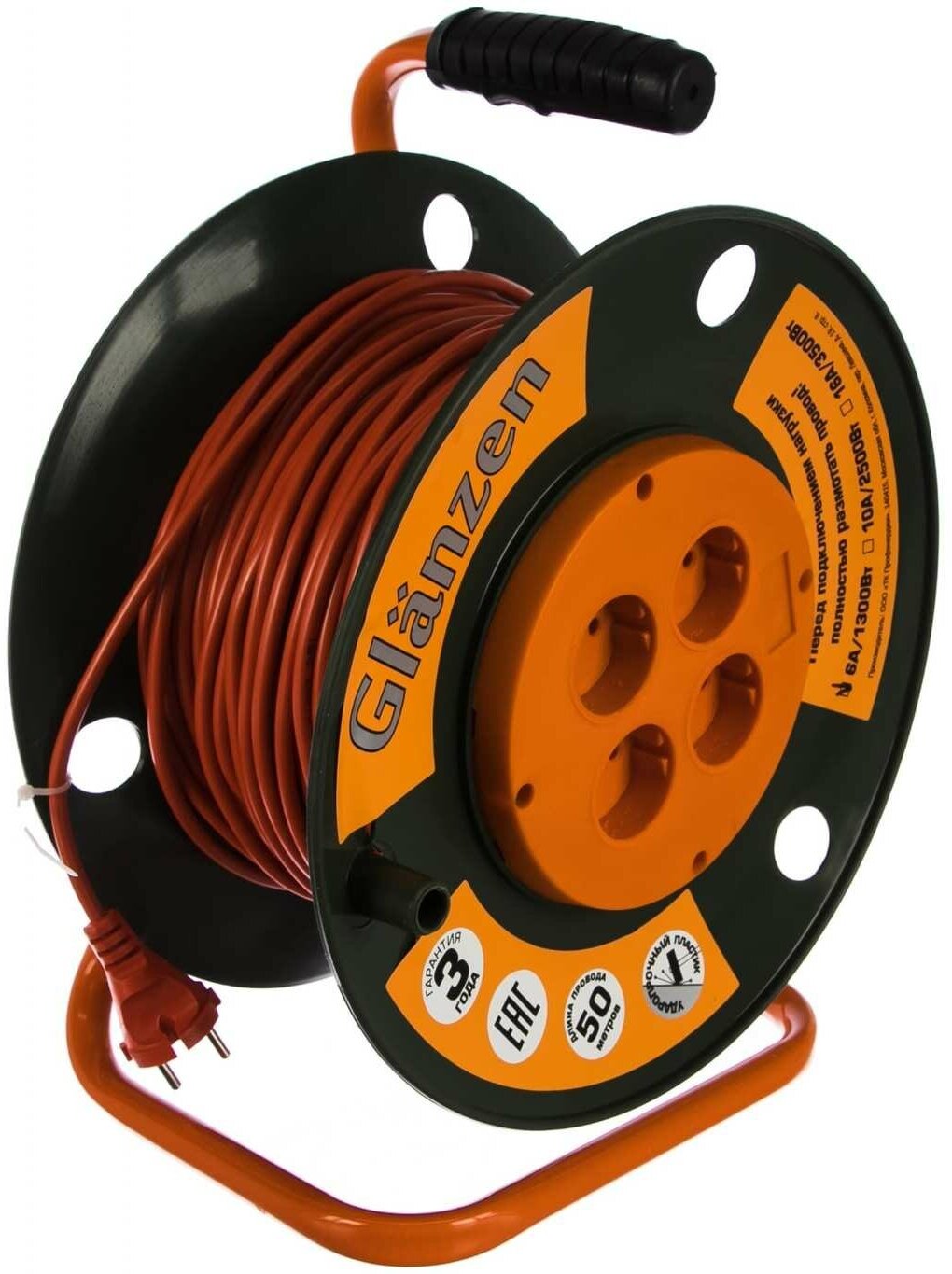 Удлинитель силовой на катушке GLANZEN 4 розетки ПВС 2х0,75 50м EB-50-001 1300Вт IP20