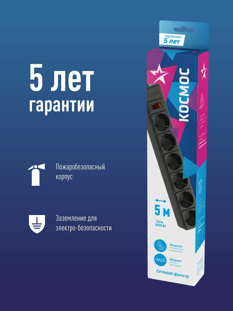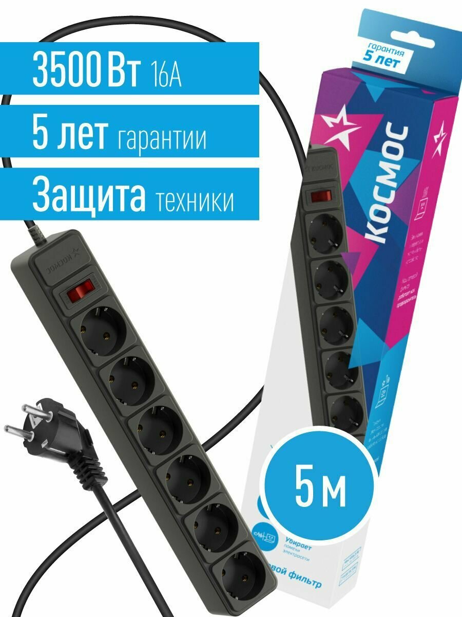 Купить Сетевой фильтр Космос Электро Космос 6х5м с заземл. 16А IP20 3.5кВт с пред. 3х1 индик. сети, черный, FKsm5m-6g(B)16A
