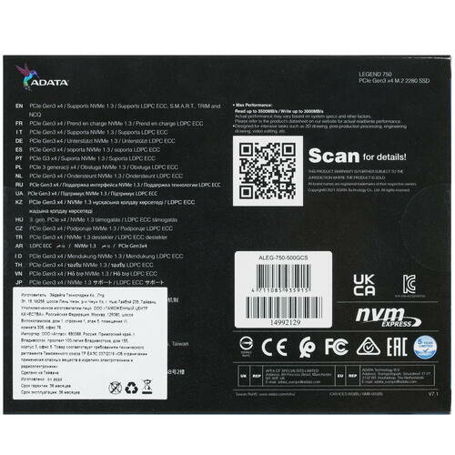 Накопитель ADATA Legend 750 ALEG-750-500GCS SSD, M.2, 500Gb, PCI-E 3.0 x4, чтение: 3350 Мб/сек, запись: 2450 Мб/сек, 3D NAND, NVMe, 300 TBW