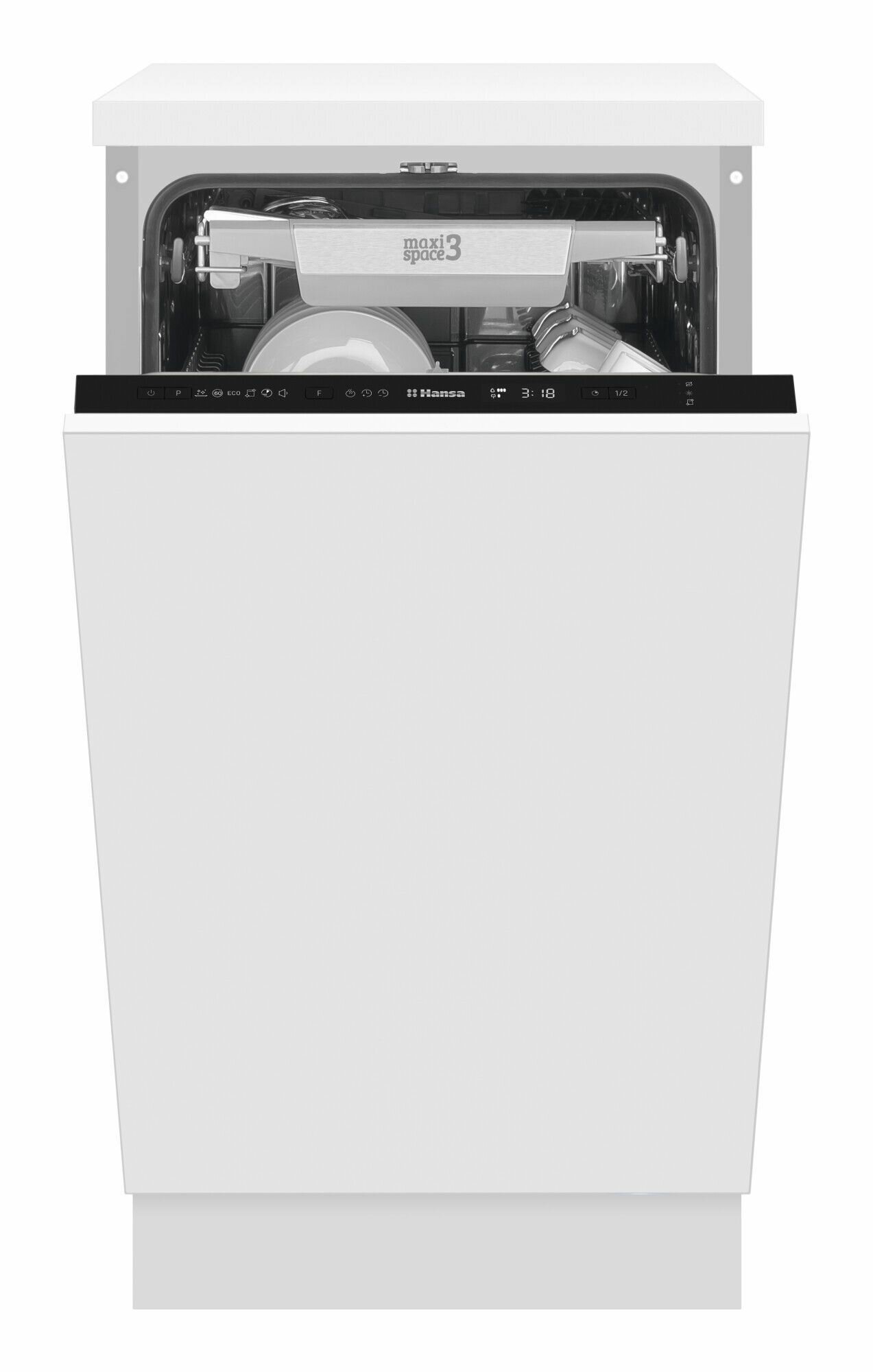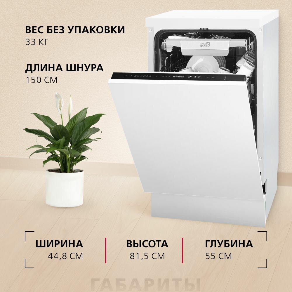 Встраиваемая посудомоечная машина Hansa ZIM426EQ, 45см, компактная, с защитой от протечек, 6 программ, 3 корзины, режим экстра сушки и половинной загрузки, функция пара и отсрочка старта