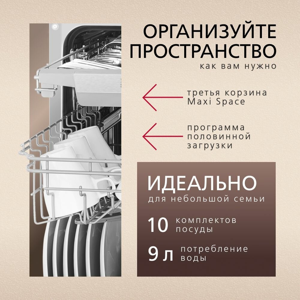| Плюсы: | Отличная посудомойка за свои деньги, тихая, удобный отсек для столовых приборов |