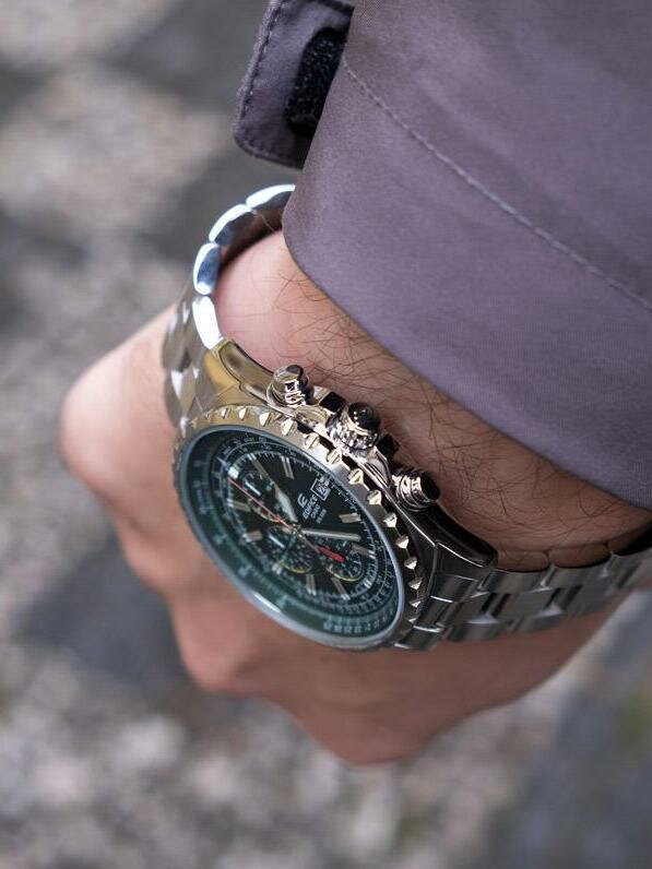 | Минусы: | Стрелки в темноте достаточно плохо сверяться, стараюсь поэтому не носить в темное время суток. Дата крутиться до 31ого числа и каждое 29ое или 30ое нужно это иметь в виду. Стрелка секунд большая начинает движение только после включения секундомера, в остальное время двигается маленькая. |