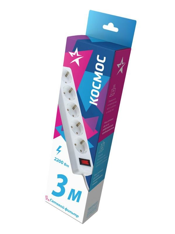 Сетевой фильтр космос 3 м, 5 розеток, пвс 3х0,75мм2, белый