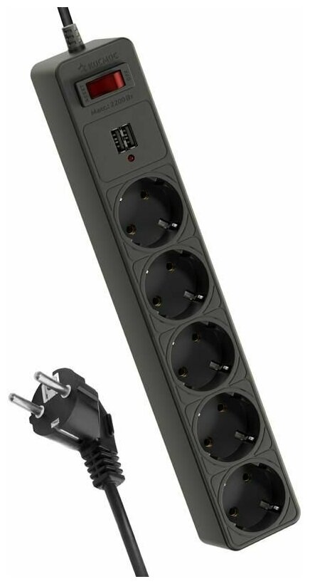 Сетевой фильтр Космос 1 8м 5 гнезд 2 USB разъема черный