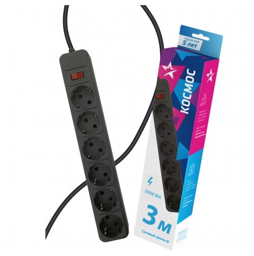 Сетевой фильтр Космос 3м 6 гнезд, черный