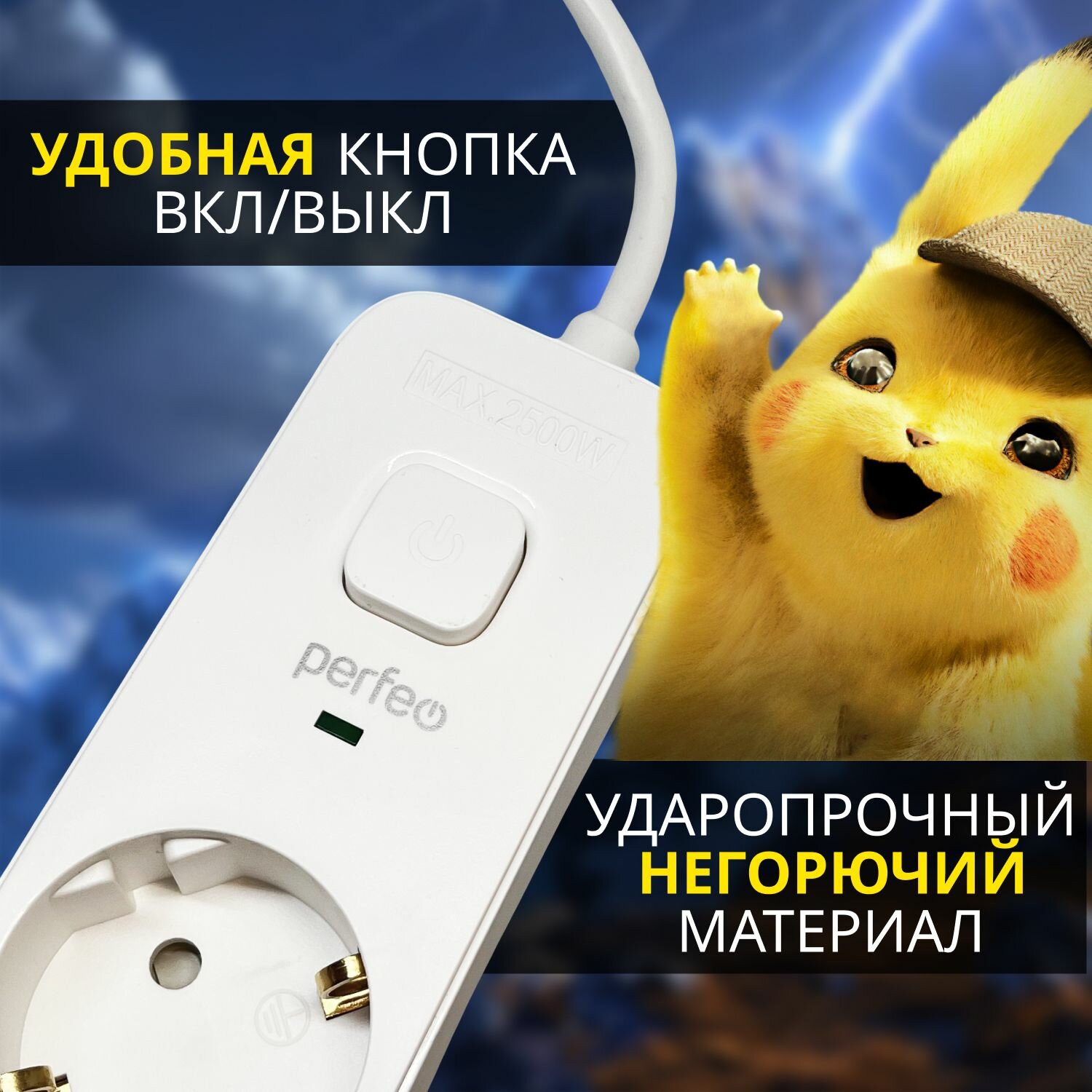 Удлинитель с автоматическим предохранителем PERFEO POWERX, 1,8 м, 5 розеток, черный