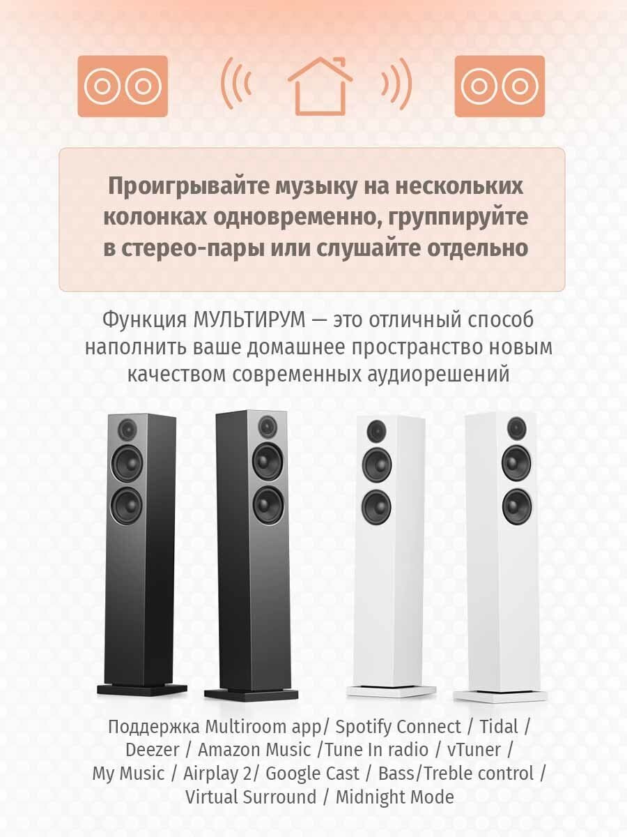 Классный полностью металлический пульт с мягким основанием. Играют довольно качественно Управляются с приложения Поддержка интернет радио Поддержка AirPlay2 Множество вариаций для подключения звука Возможность подключения сабвуфера |