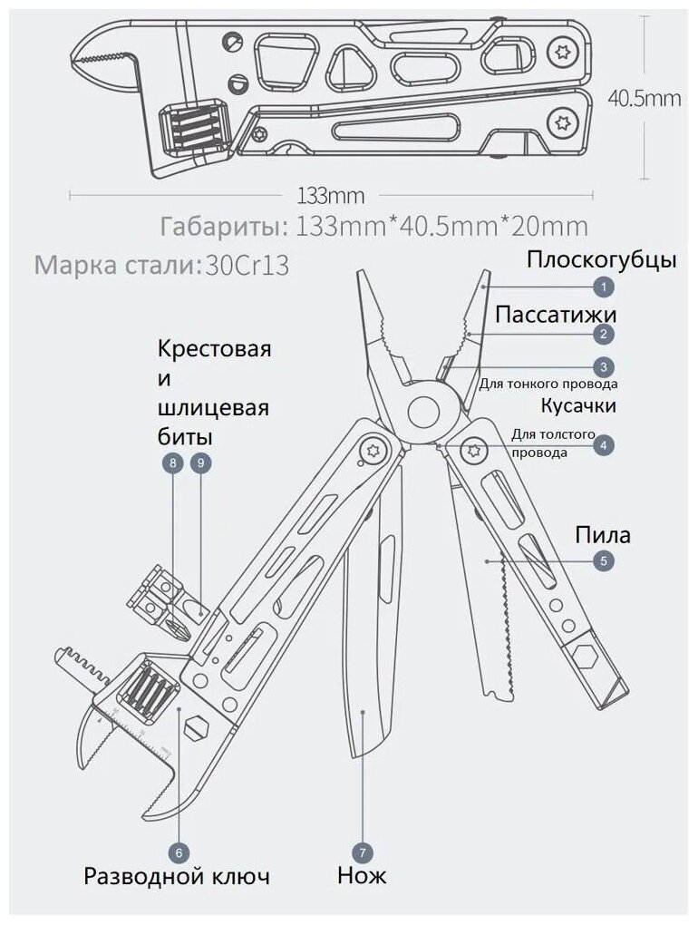 | Инструменты (функции) | гаечный ключ / нож / отвертка / пассатижи / пила / плоскогубцы / Разводной ключ |
