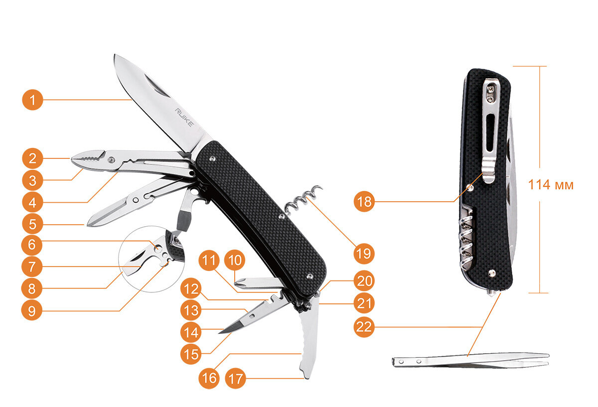 | Инструменты (функции) | кусачки / нож / ножницы / отвертка / открывалка для бутылок / пинцет / шило / кернер / штопор |