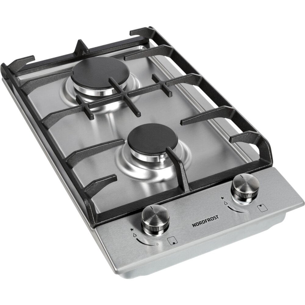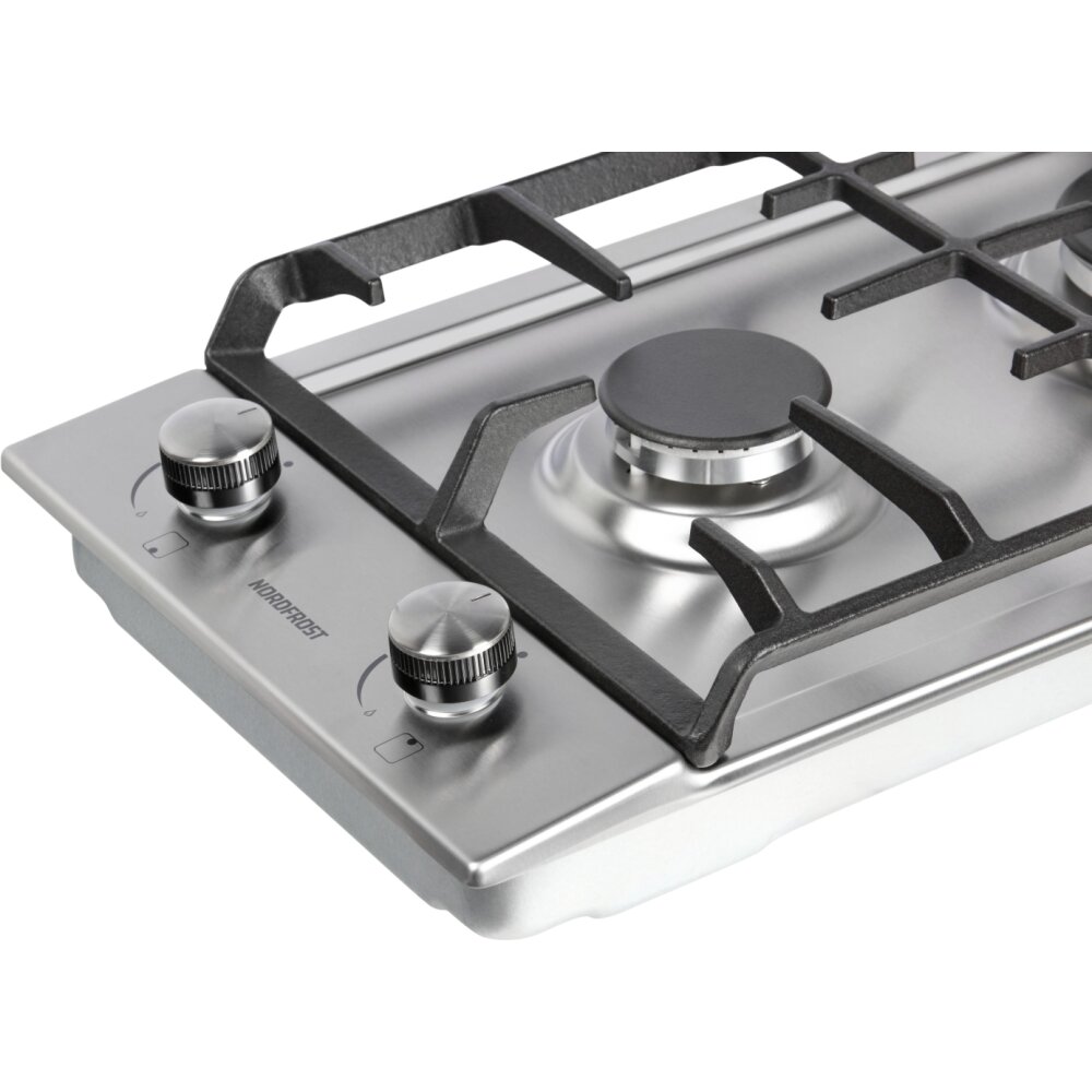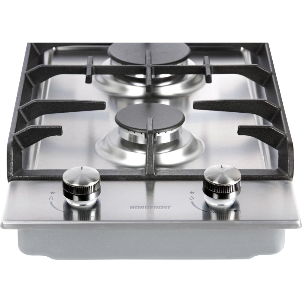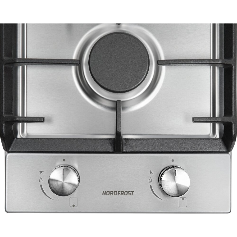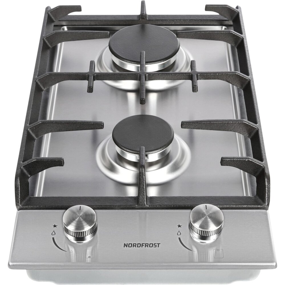 Газовая варочная поверхность NORDFROST HS 3022 X, электророзжиг, 2 конфорки, чугунные решетки, нержавеющая сталь
