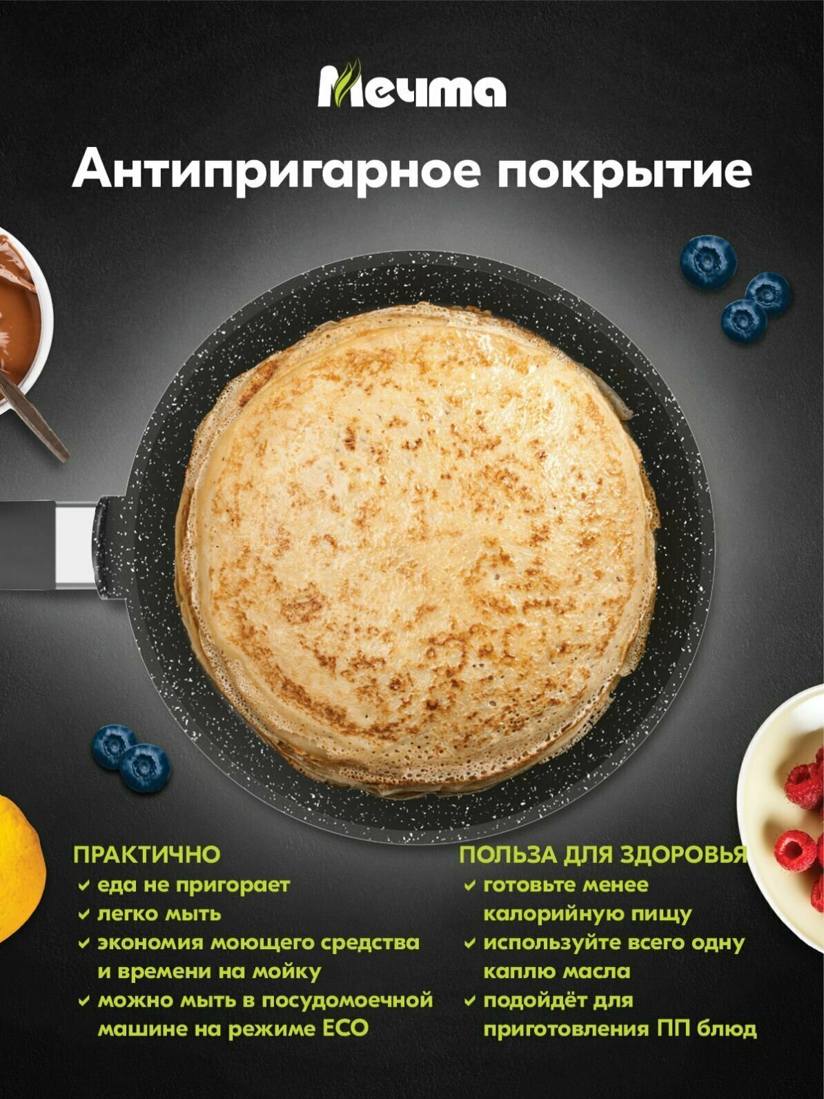 СохранитьСковорода Мечта Посуда Мечта блинная Гранит black 20см (10802) интересное: