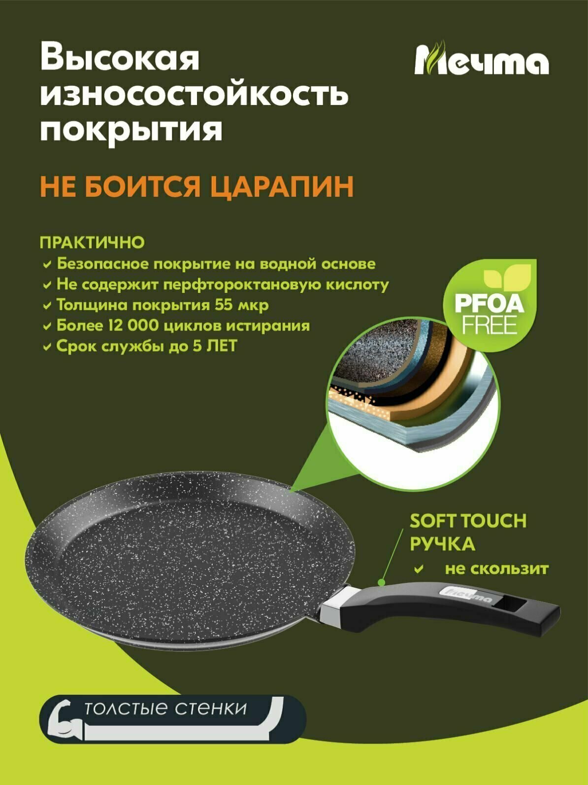 Сковорода Мечта 18 см Премиум с антипригарным покрытием со съемной ручкой, НЕ индукционная