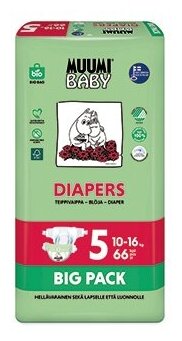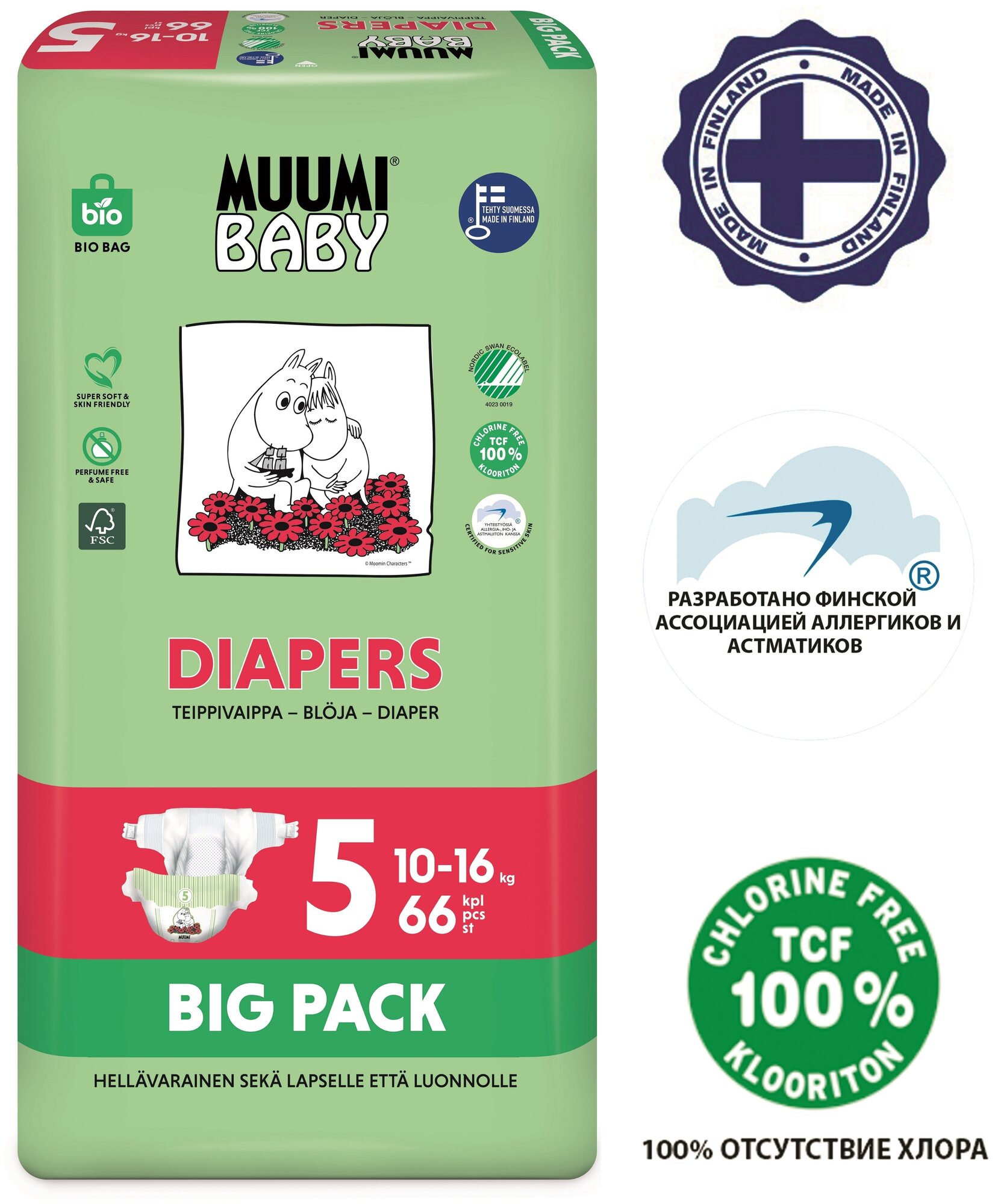MUUMI BABY Подгузники натуральные, без добавок, эко, биоразлагаемые детские №5, 10-16 кг, 66 шт