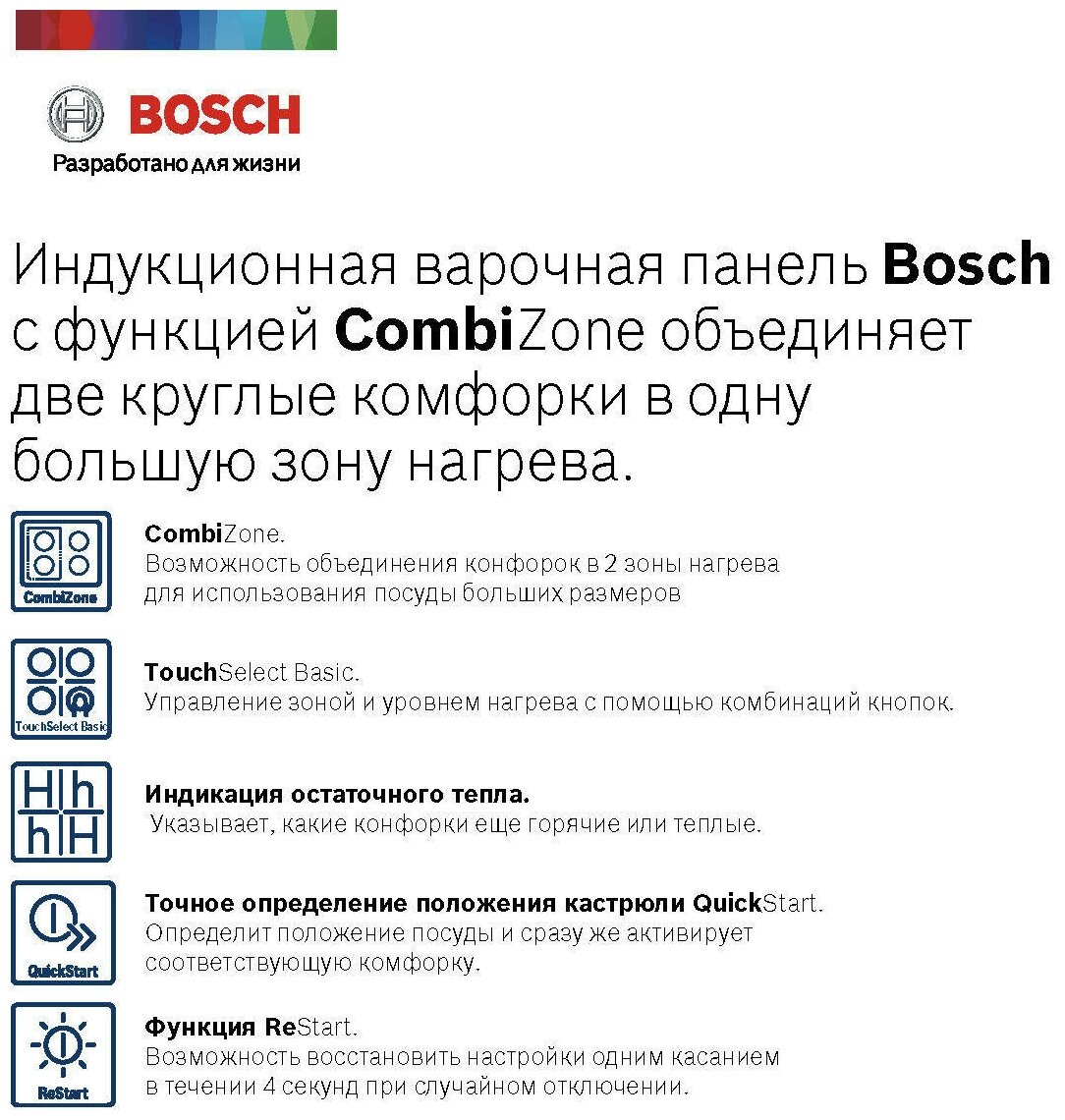 СохранитьSerie 4, индукционная варочная поверхность, 60 см, стеклокерамика, черная, скошенный фронт, 4 конфорки, две конфорки слева можно объединить в CombiZone, управление TouchSelect, таймер, распознавание наличия посуды, функция PowerBoost, индикация остаточног интересное: