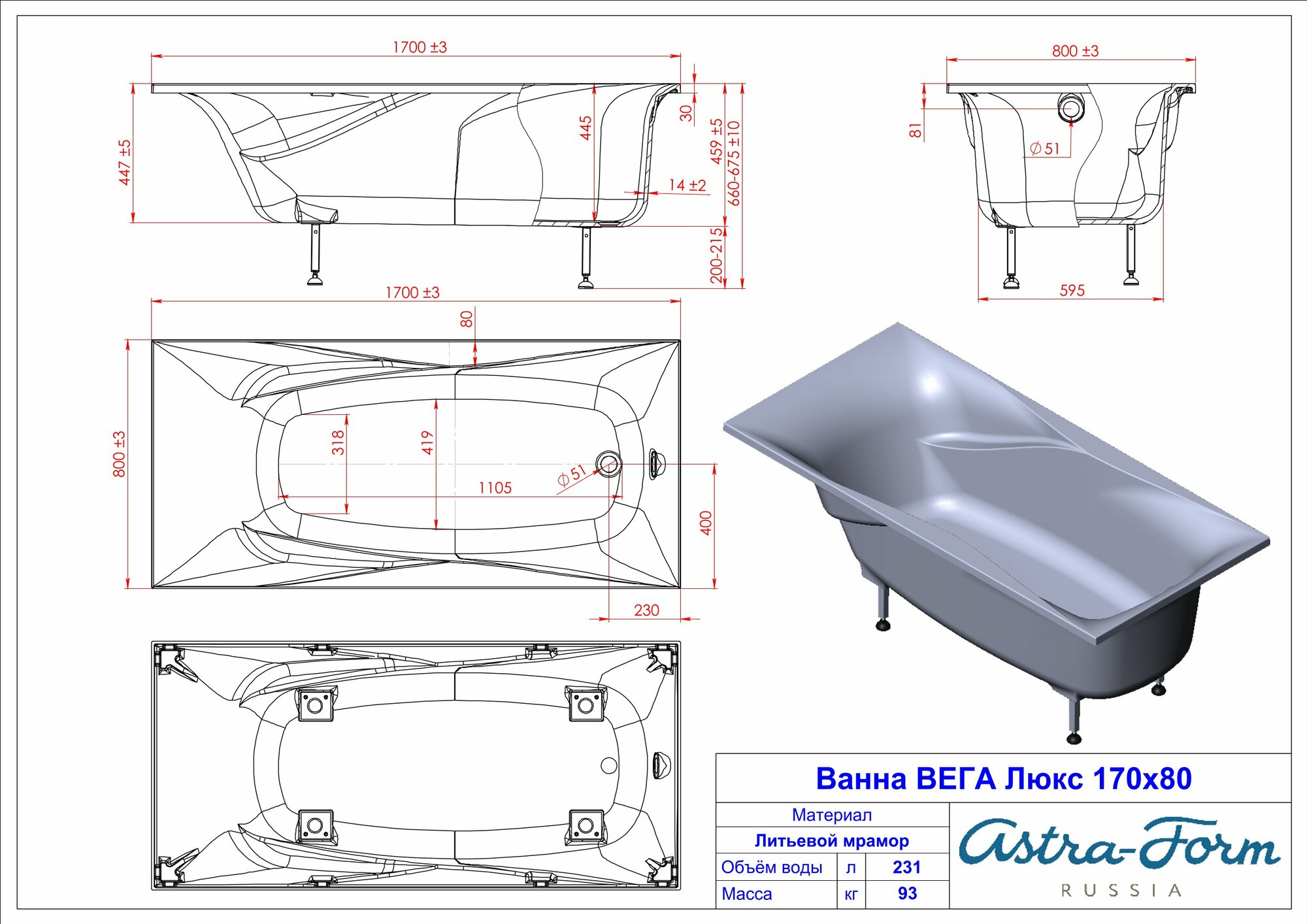Ванна из литьевого мрамора Astra-Form Вега Люкс 170x80 в комплекте с ножками