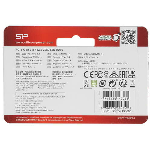 Внутренний SSD M.2 Silicon Power 1.0TB UD80 /SP01KGBP34UD8005/ (PCI-E 3.0 х4, up to 3400/3000MBs, 3D TLC, NVMe 1.3, 600TBW, 22х80mm)