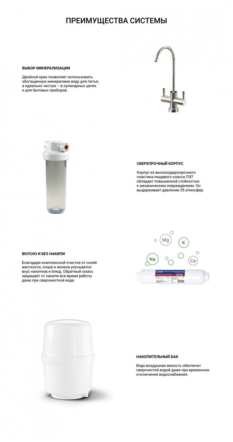 Система обратного смоса Гейзер Премиум-П, для квартир с низким магистральным давлением, воду можно пить без кипячения, безопасно для новорожденных, 20052