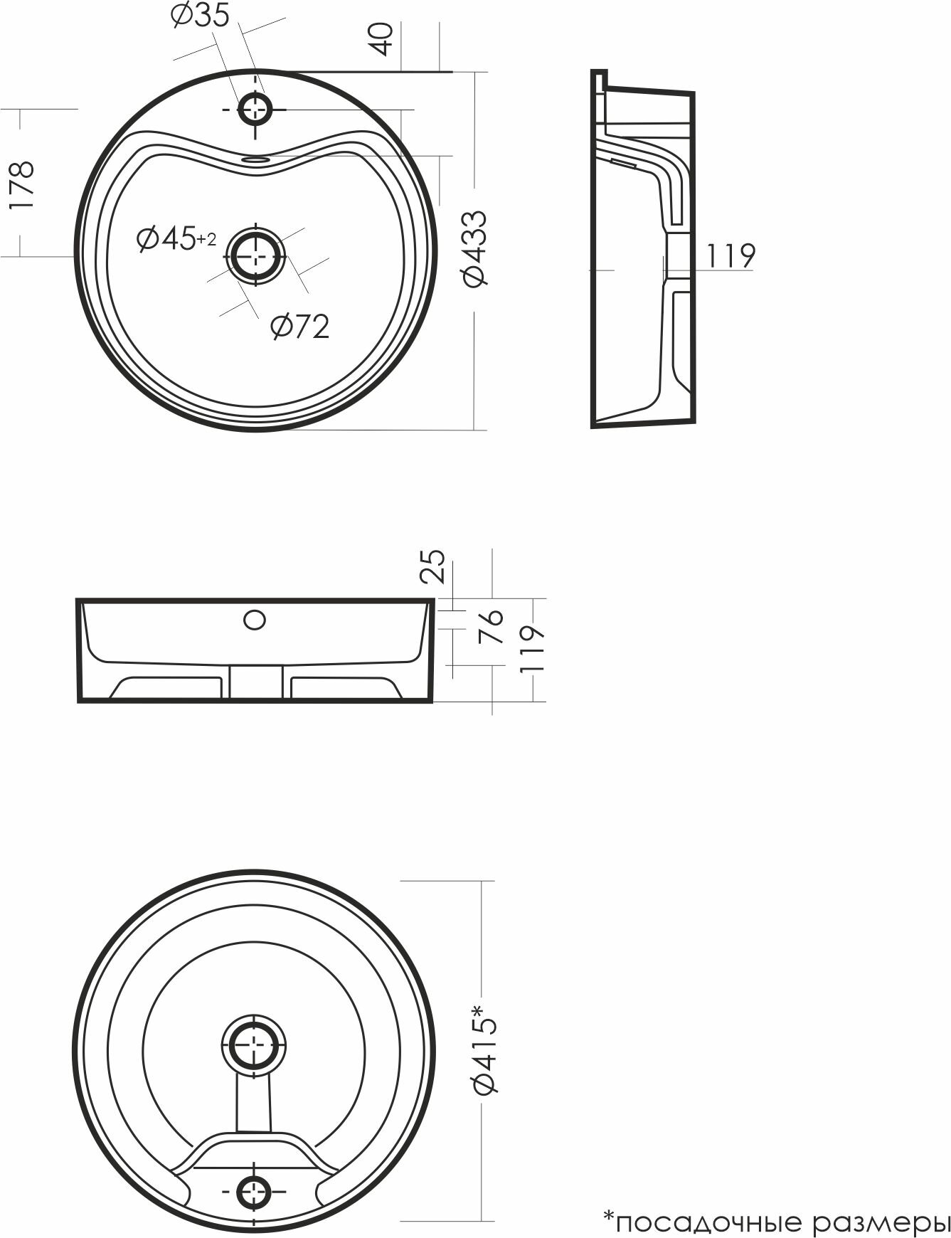 Умывальник Sanita Luxe BEST SHELF (Санита Люкс) d433 мм, накладной, белый