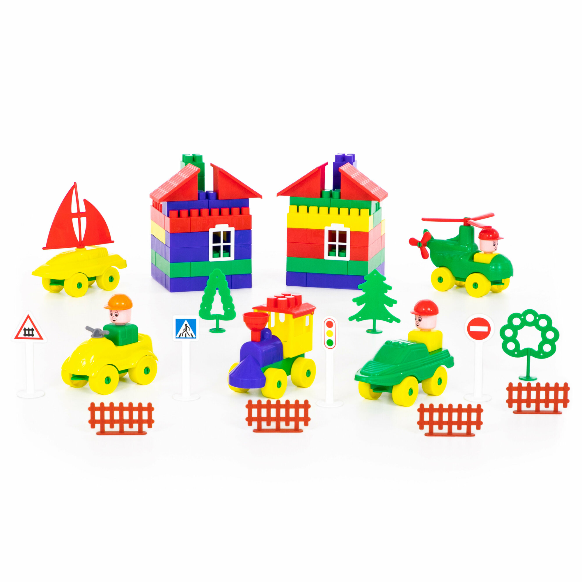 | Комплектация | 144 пластиковые детали различных форм и размеров, а также игрушечные яхта, грузовик, автокран, машинки, вертолет, поезд, светофоры, дорожные знаки и человечки-водители |