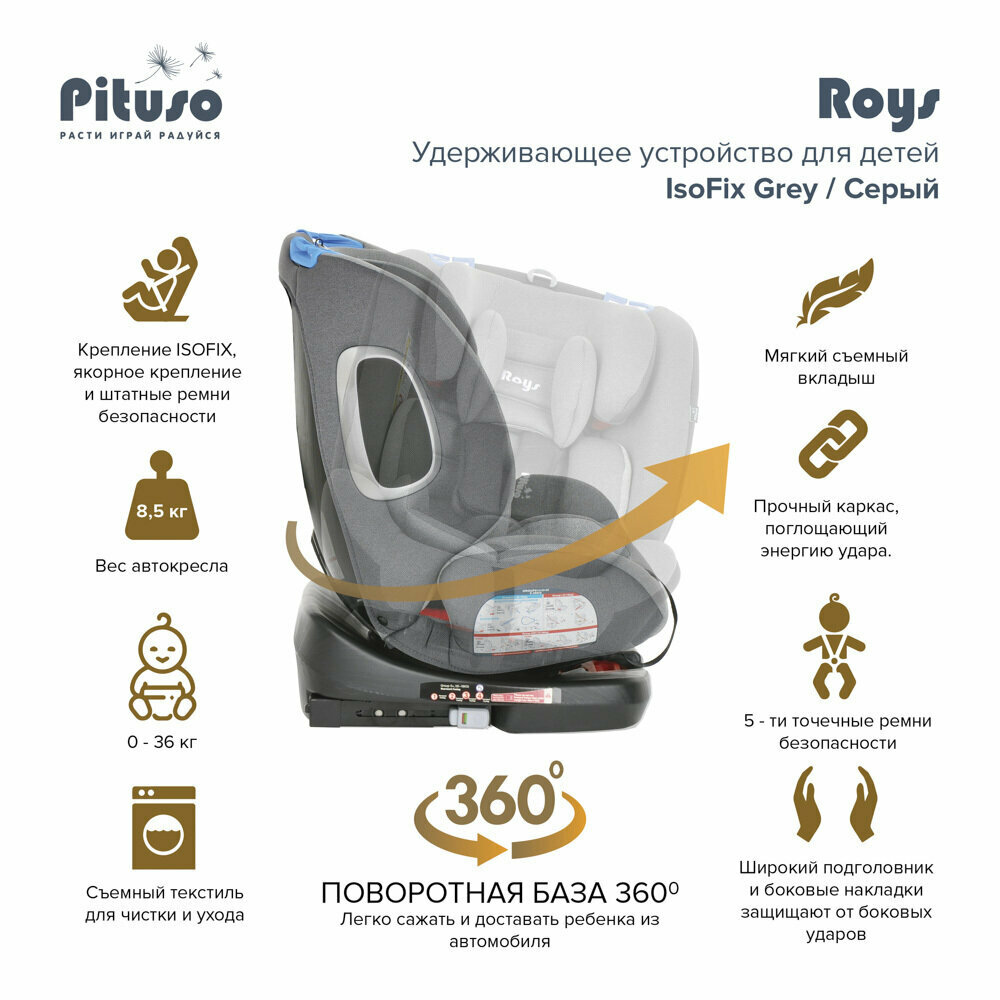 Автокресло детское Pituso Roys isofix поворотное на 360 с положение для сна от 0-36 кг группа 0/1/2/3 Rubin Grey/Рубиново-Серый