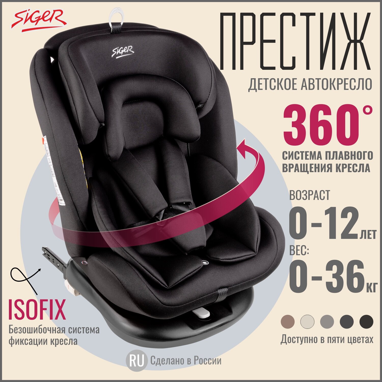 Автокресло детское поворотное с рождения до 12 лет / Isofix / 0+/1/2/3/до 36 кг 0-36кг / 0-12лет, Siger Престиж , маренго