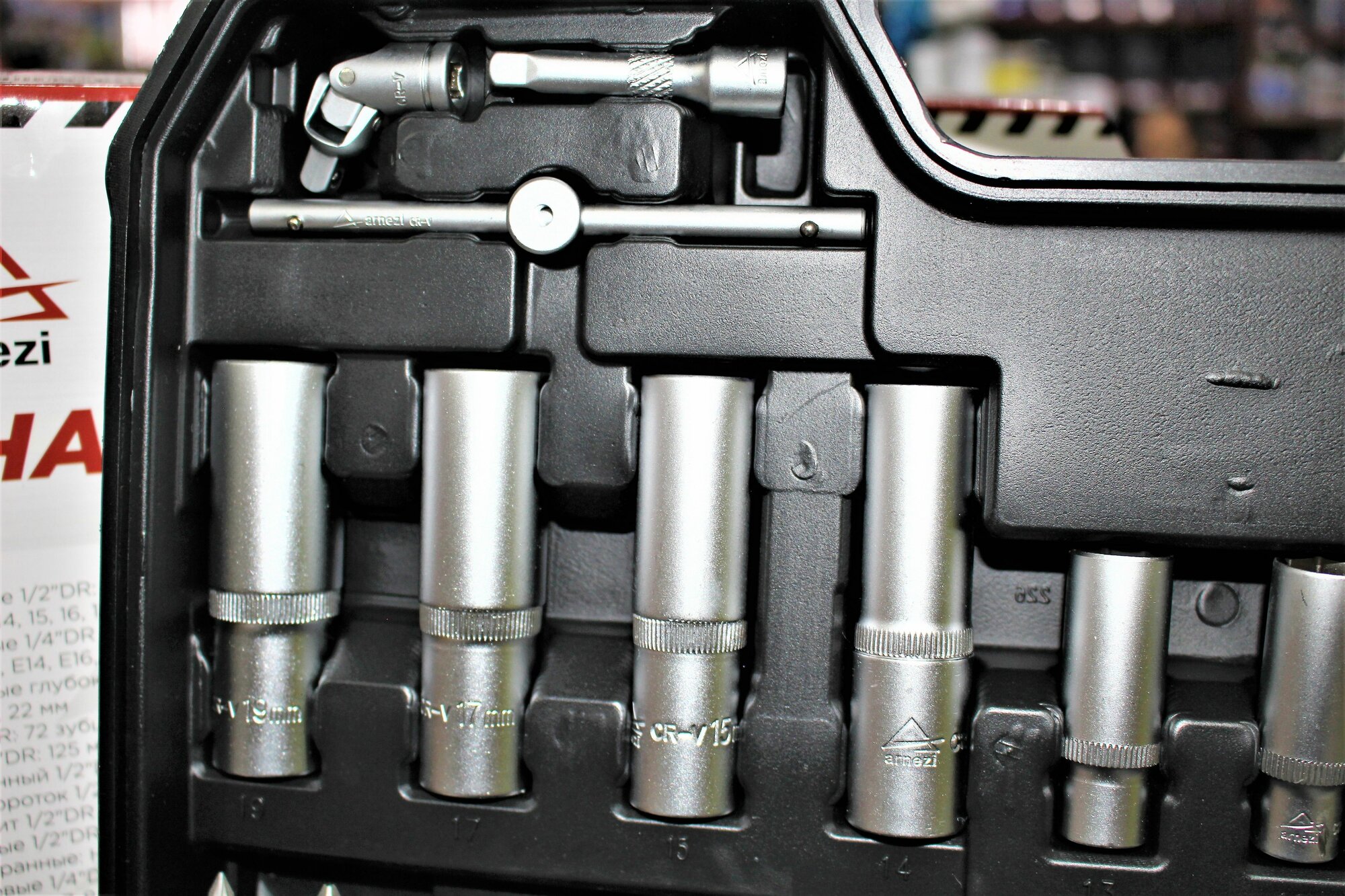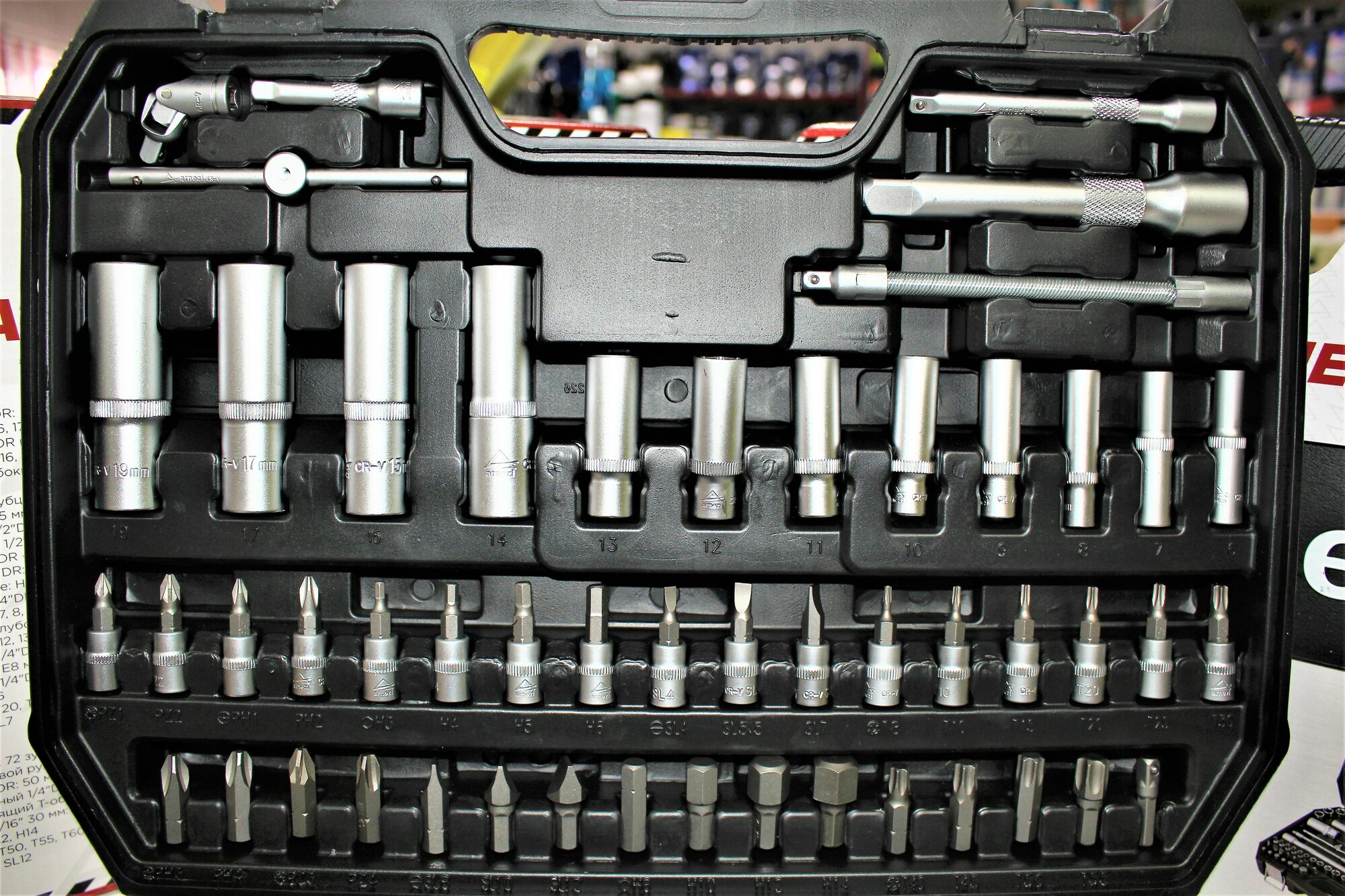 | Головки торцевые подробно | головки торцевые 1/4”: 4, 4.5, 5, 5.5, 6, 7, 8, 9, 10, 11, 12, 13, 14 мм; головки торцевые глубокие 1/4”: 6, 7, 8, 9, 10, 11, 12, 13 мм; головки торцевые 1/4” со вставкой: H3, H4, H5, H6, T8, T10, T15, T20, T25, T30, SL4, SL5.5, SL6.5, PH1, PH2, PZ1, PZ2; головки торцевые 1/2”: 14, 15, 16, 17, 18, 19, 21, 22, 24, 27, 30, 32 мм; головки торцевые глубокие 1/2”: 14, 15, 17, 19 мм; головки свечные 1/2” :16 мм, 21 мм; трещотка 1/4”: 72 зубца; трещотка 1/2”: 72 зубца; вороток скользящий Т-образный 1/4”; 2 удлинителя 1/4” (50 мм, 100 мм); 2 удлинителя 1/2” (125 мм, 250 мм); шарнир карданный 1/4”; шарнир карданный 1/2”; вороток с торцевой рукояткой 1/4”; адаптер 1/2” |