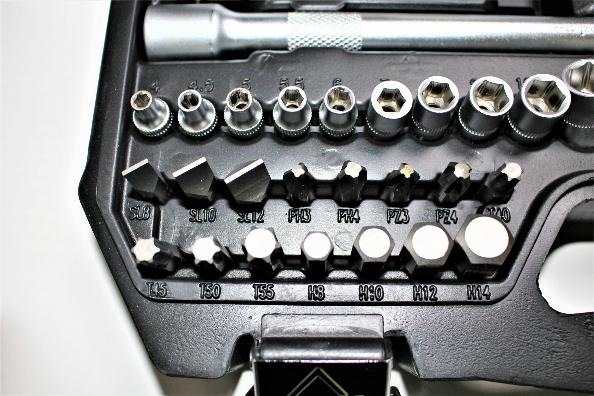 | Головки торцевые подробно | 1/4”: 4, 4.5, 5, 5.5, 6, 7, 8, 9, 10, 11, 12, 13, 14 мм; 1/4” с вставкой: H3, H4, H5, H6, T8, T10, T15, T20, T25, T30, SL4, SL5.5, SL7, PH1, PH2, PZ1, PZ2; трещотка 1/4”DR 72 зубца; вороток скользящий Т-образный 1/4”DR; удлинитель 1/4”DR: 50 мм, 100 мм; шарнир карданный 1/4”DR; удлинитель гибкий 1/4”DR: 150 мм; вороток с торцевой рукояткой 1/4”DR; переходник с 1/4”DR на 1/4”HDR; 1/2”: 14, 15, 16, 17, 18, 19, 21, 22, 24, 27, 30, 32 мм; трещотка 1/2”DR 72 зубца; шарнир карданный 1/2”DR; удлинитель 1/2”DR: 125 мм, 250 мм; свечные 1/2”: 16 мм, 21 мм |