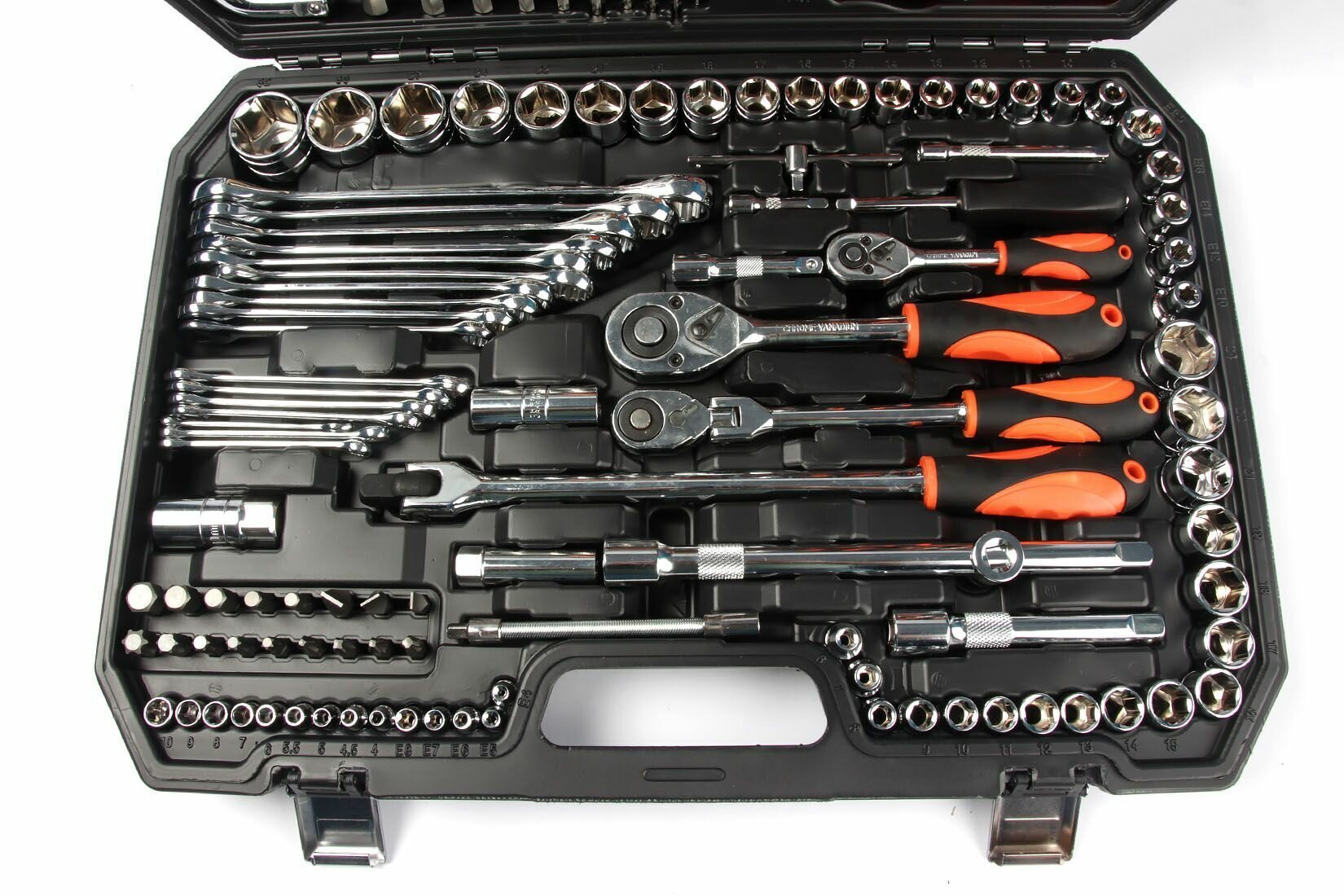 | Головки торцевые подробно | удлинённые 1/2: 14, 15, 17, 19 мм; удлинённые 1/4: 6, 7, 8, 9, 10, 11, 12, 13 мм; 1/2: 10, 11, 12, 13, 14, 15, 16, 17, 18, 19, 20, 21, 22, 23, 24, 27, 30, 32; 1/4: 4, 4.5, 5, 5.5, 6, 7, 8, 9, 10, 11, 12, 13, 14; свечная 1/2: 16, 21; с наконечником: SL: 4, 5.5, 7, РН: 1, 2, Т: 8, 10, 15, 20, 25, 30, РZ: 1, 2, НЕХ: 3, 4, 5, 6 |