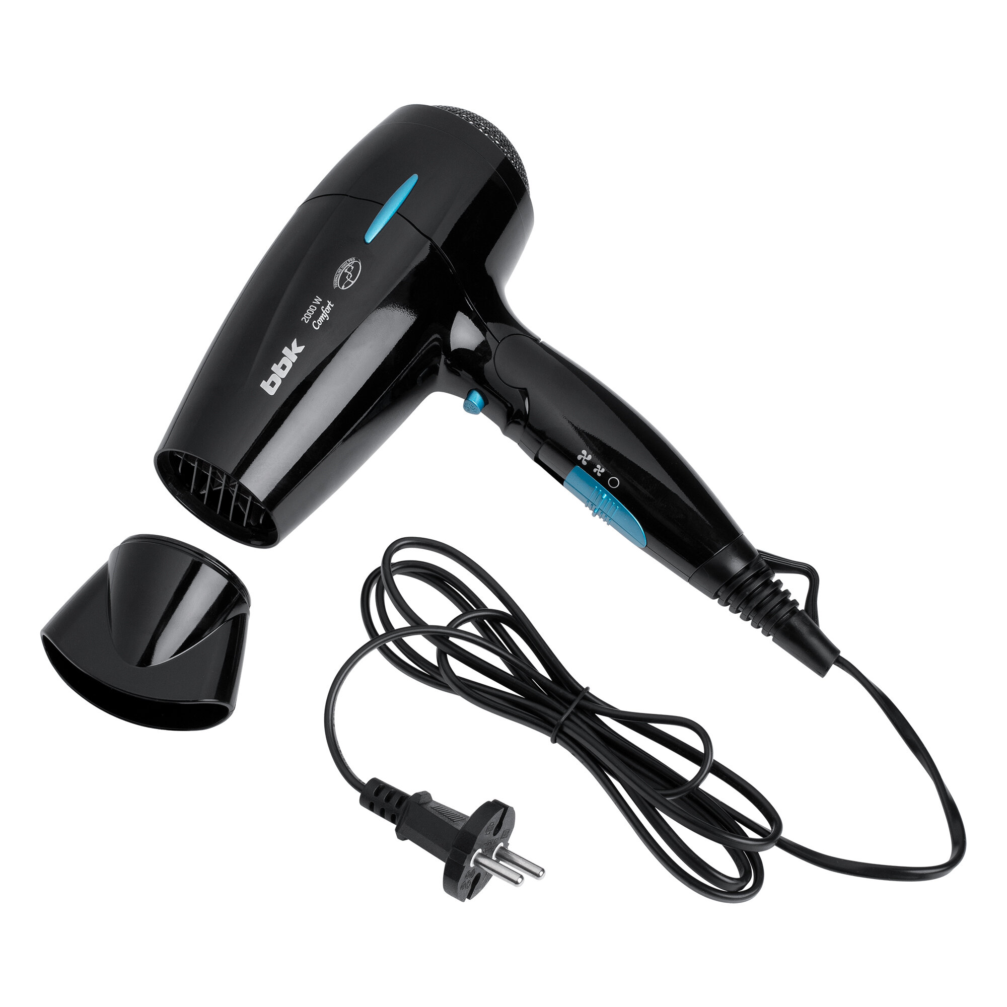 Фен BBK BHD3201i, черный/голубой /2000 Вт, складной, 2 реж., складной, ионизация, концентратор/
