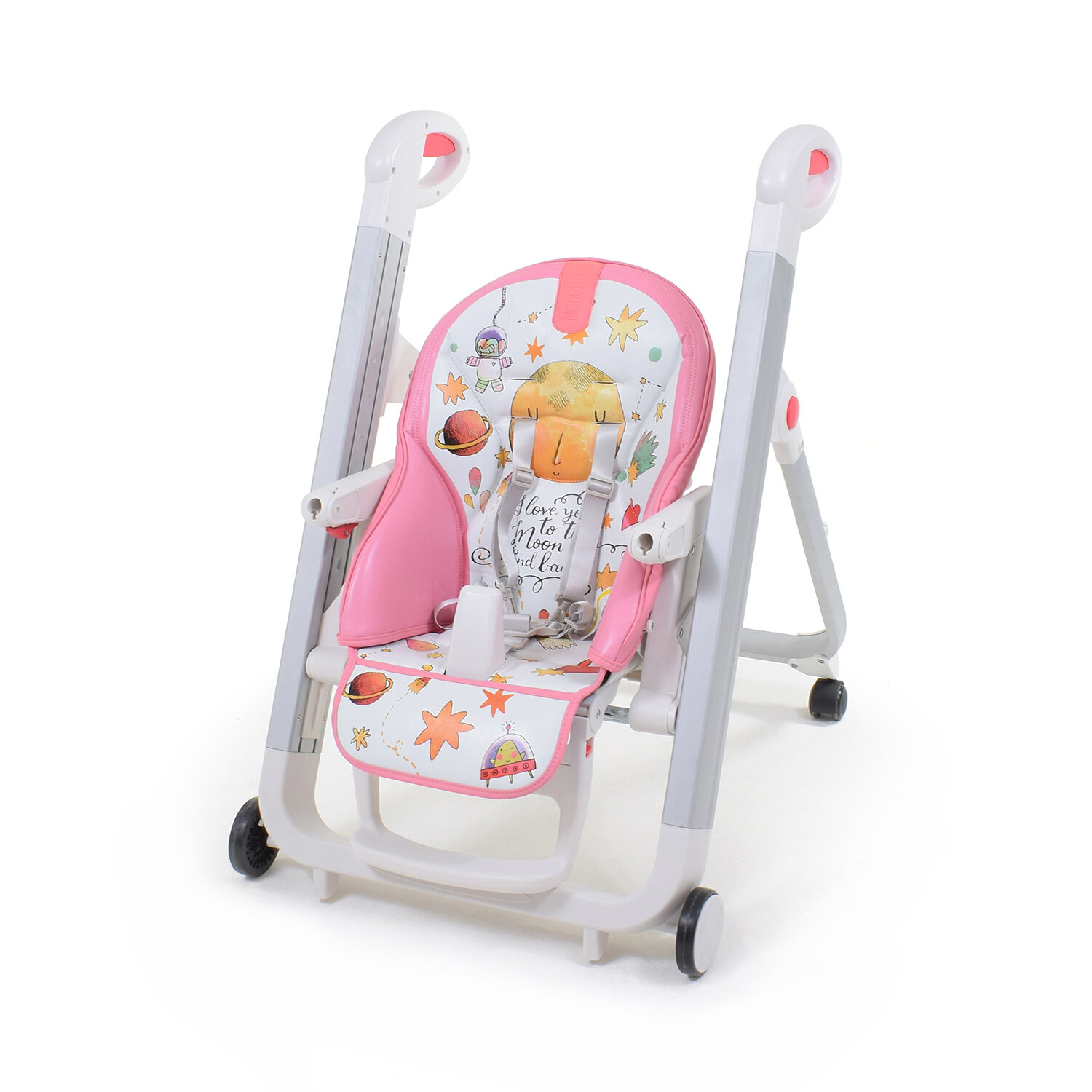 Безопасность на уровне! Многим не нравятся колеса!ну это же не компьютерный стул,чтобы во все стороны кататься!Колеса для того чтобы удобно придвинуть к столу,или наоборот отьехать.Они по умолчанию заблокированы,чтобы ребенок сам не мог ездить в стуле оттолкнувшись ногами. Складывается легко. Легко мыть сиденье.оно снимается |