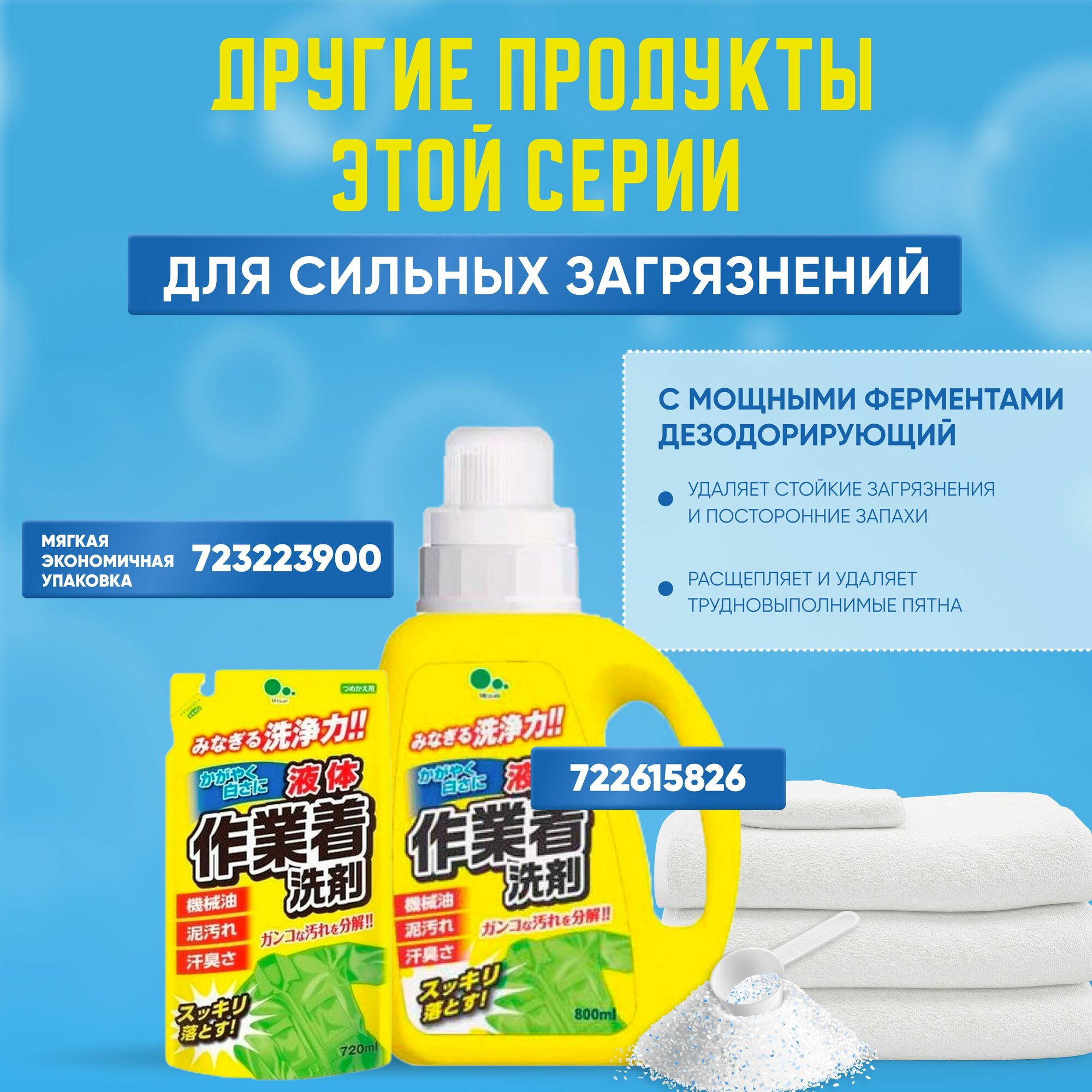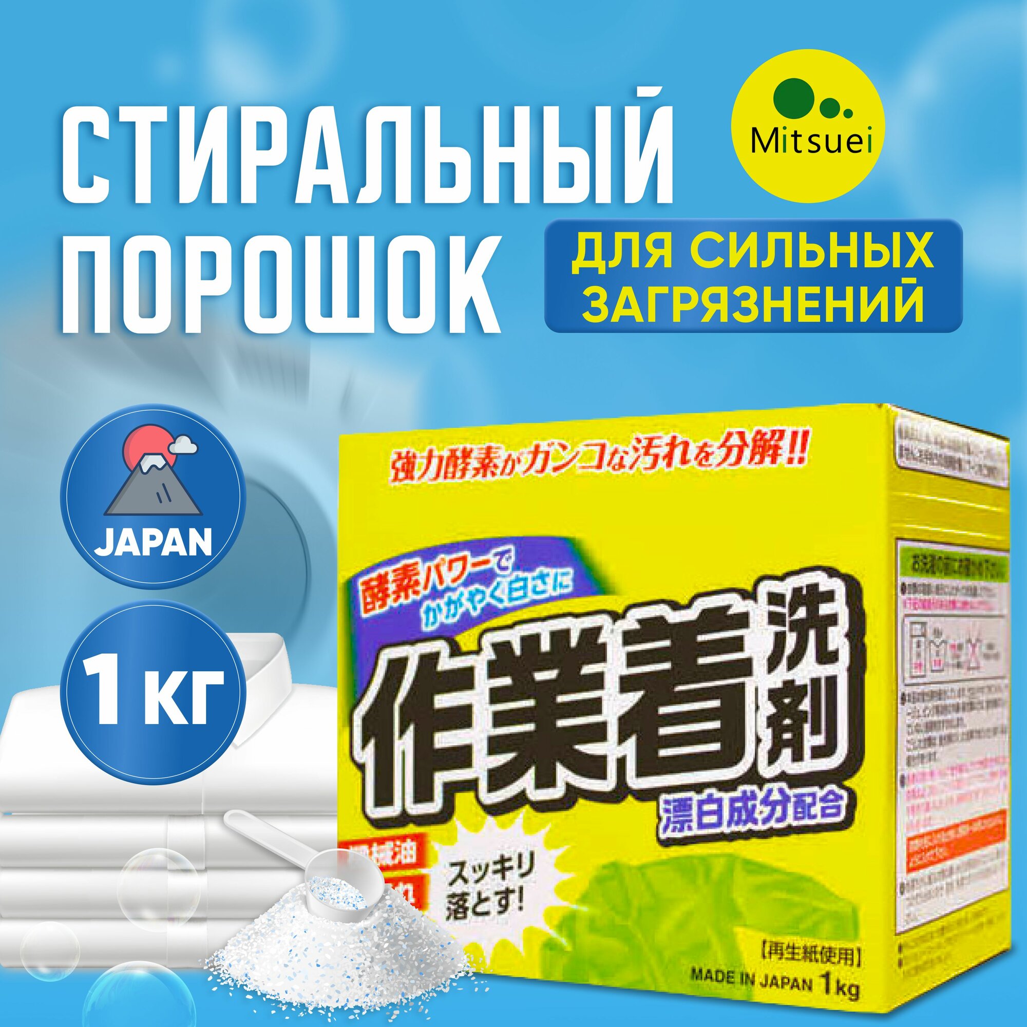 Мощный стиральный порошок с ферментами и отбеливателем для сильных загрязнений / MITSUEI / 1000 г.