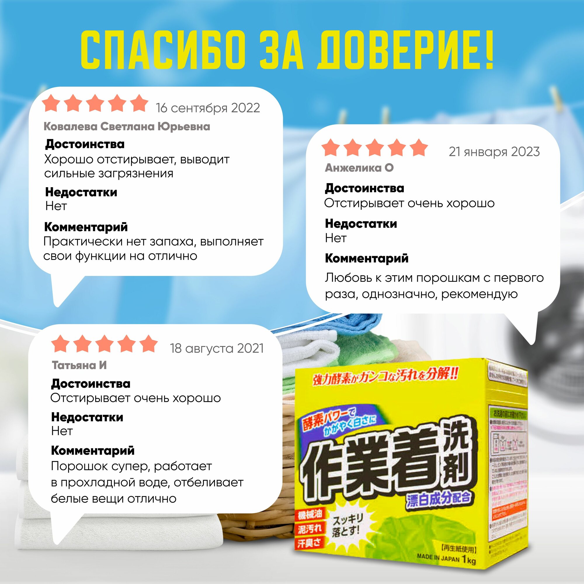Ниже Вы можете прочитать отзывы на Стиральный порошок "Mitsuei", с отбеливателем и ферментами, 1 кг, ознакомится с подробными характеристиками, посмотреть интересные обзоры и фотографии на Стиральный порошок "Mitsuei", с отбеливателем и ферментами, 1 кг.