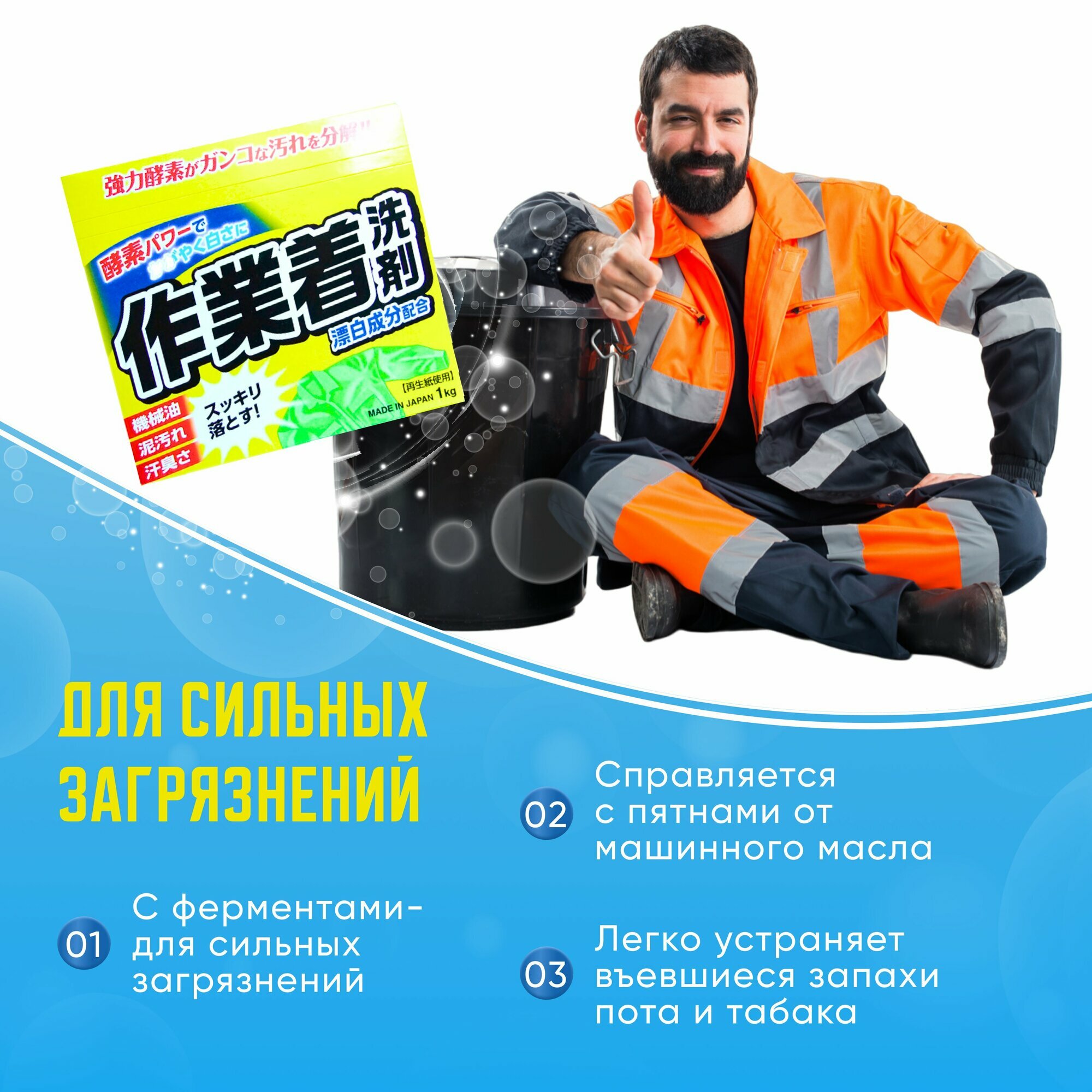 Мощный стиральный порошок с ферментами и отбеливателем для сильных загрязнений (в т.ч. на рабочей одежде, дезодорирующий) 1кг