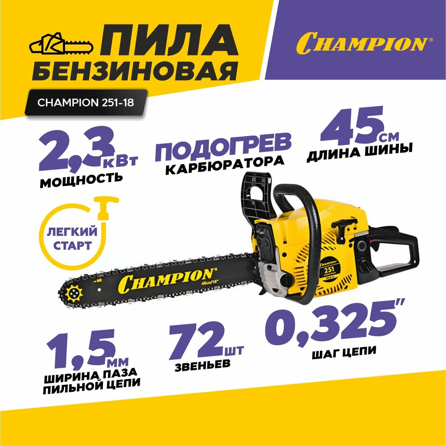 Бензопила Champion 251-18" 0,325-1,5-72 (2,3кВт легкий старт 5,2кг)