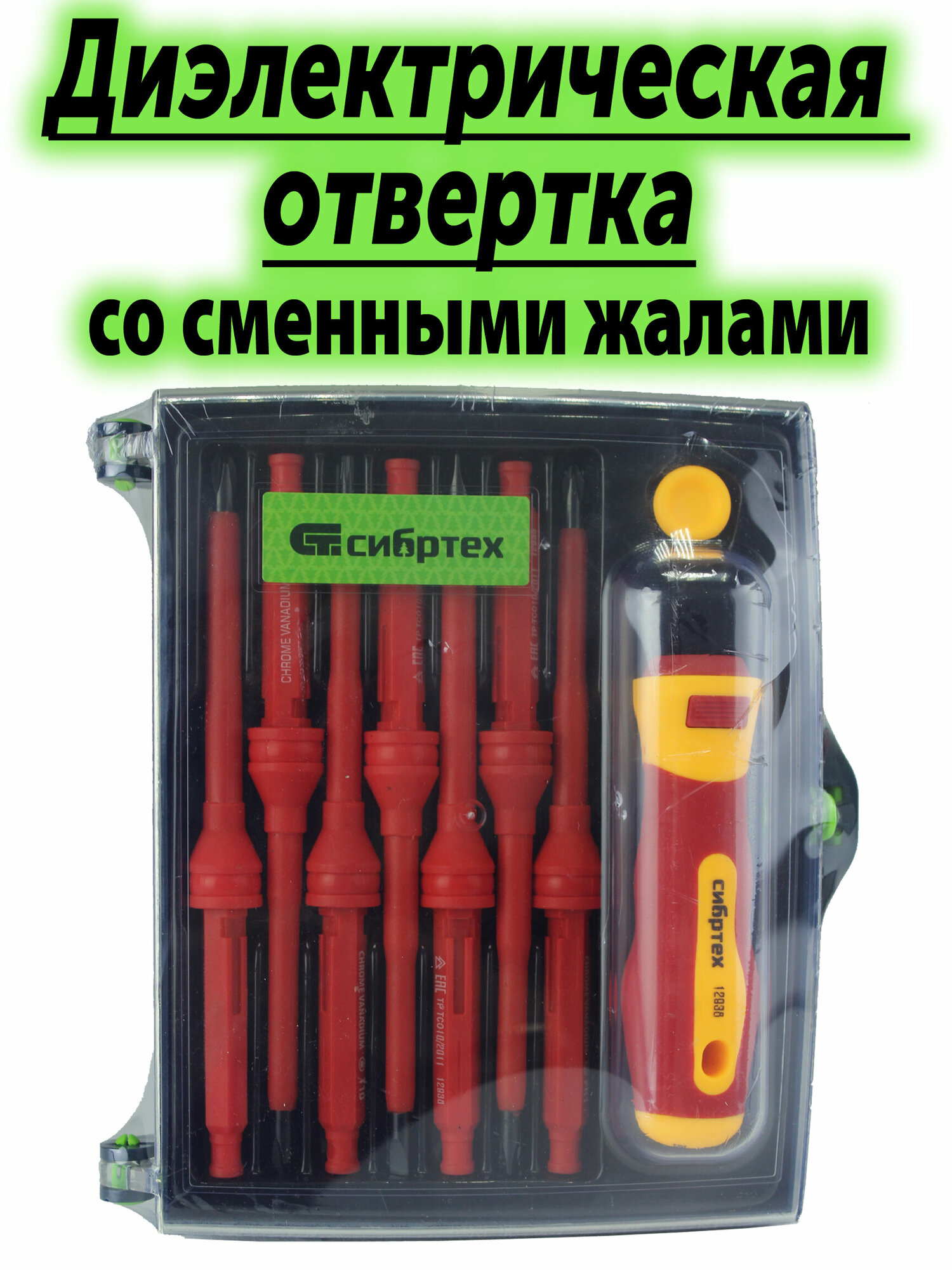 Отвертка со сменными жалами Сибртех диэлектрическая до 1000 В, 9 предметов, CrV 12938