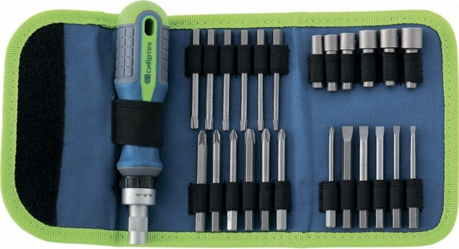 Отвертка реверсивная СИБРТЕХ 13376 с набором бит и торцевых головок, 26 шт., CrV, чехол