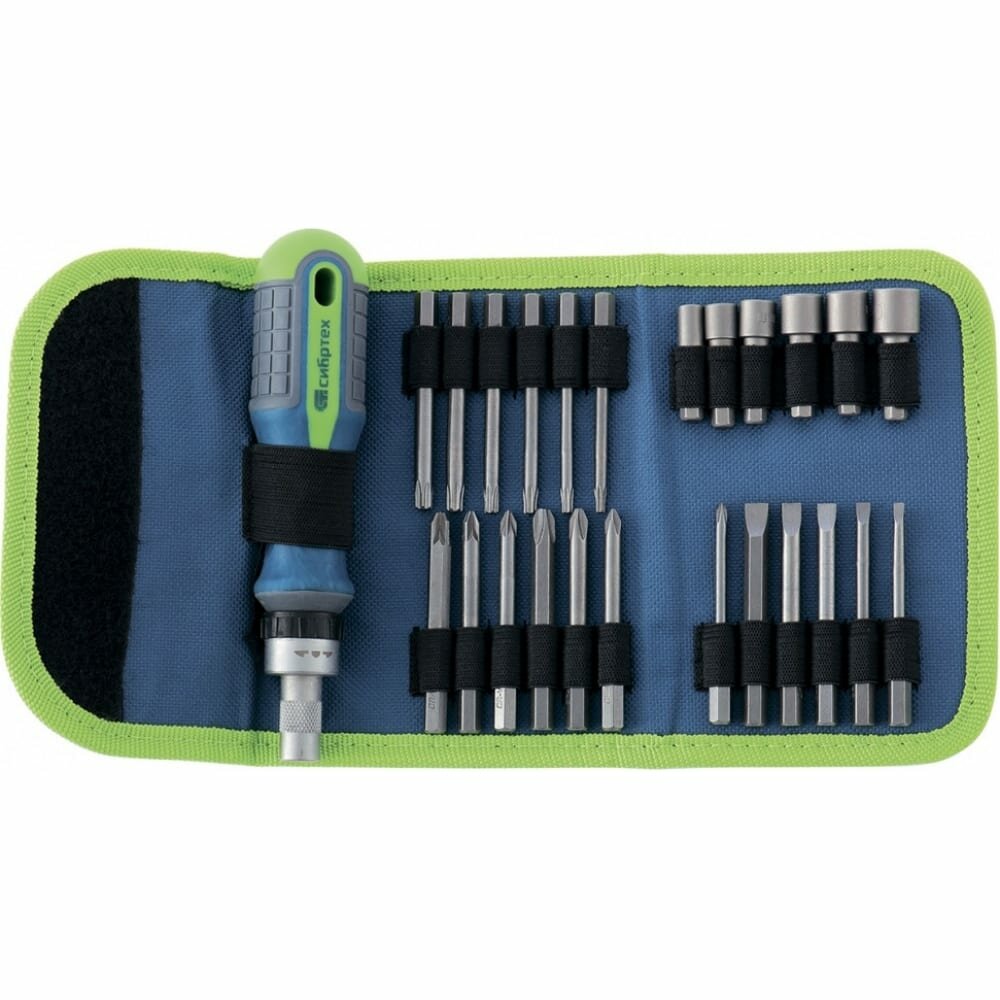 Отвертка реверсивная СИБРТЕХ 13376 с набором бит и торцевых головок 26шт crv чехол