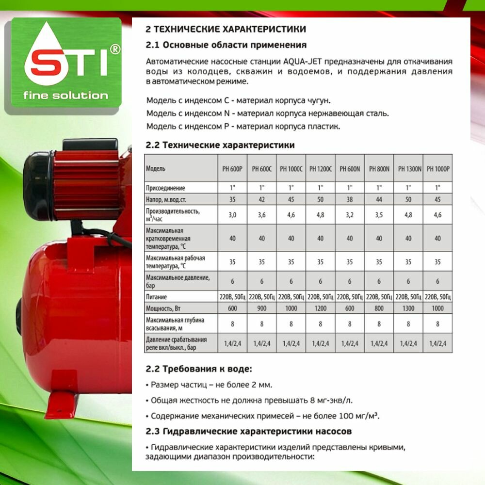 Насосная станция STI AQUA-JET PH-600 P, напор 35 м, 1000 Вт, 50 л/мин. В упаковке шт: 1 интересное: