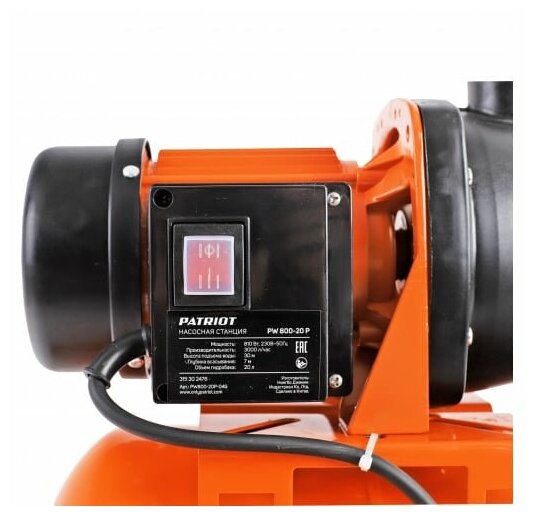 Насосная станция PATRIOT PW 800-20 P/ 3000 л*час / глубина погружения 7м / напор 30м / 800 вт./ гидроаккумулятор