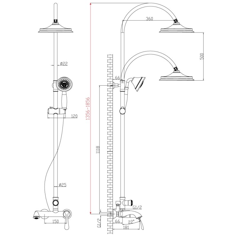 | Дополнительная информация | высота стойки для душа: 1856 мм; диаметр верхнего душа: 228 мм |