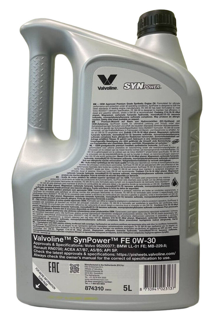 VALVOLINE 872559 Valvoline SYNPOWER FE 0W30/масо моторное/ 20L Valvoline SYNPOWER FE 0W30/масо моторн