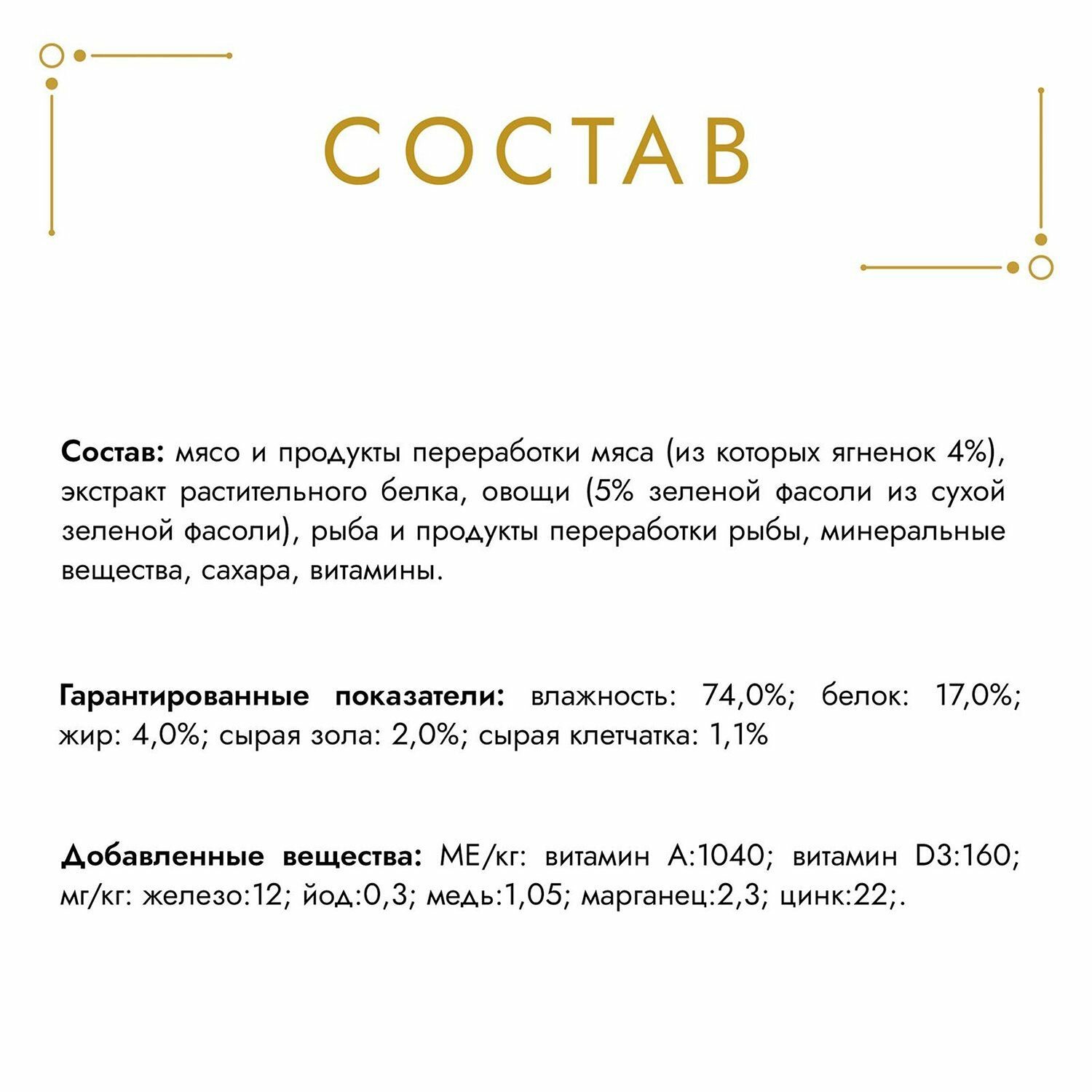 | Состав | мясо и продукты переработки мяса (из которых ягненок 4%), экстракт растительного белка, овощи (5% зеленой фасоли из сухой зеленой фасоли), рыба и продукты переработки рыбы, минеральные вещества, сахара, витамины |