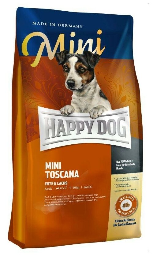 Купить Сухой корм "Happy Dog" Supreme Mini Toscana 300г д-собак мелких пород с избыт. весом и с чувств. пищ, утка и лосось