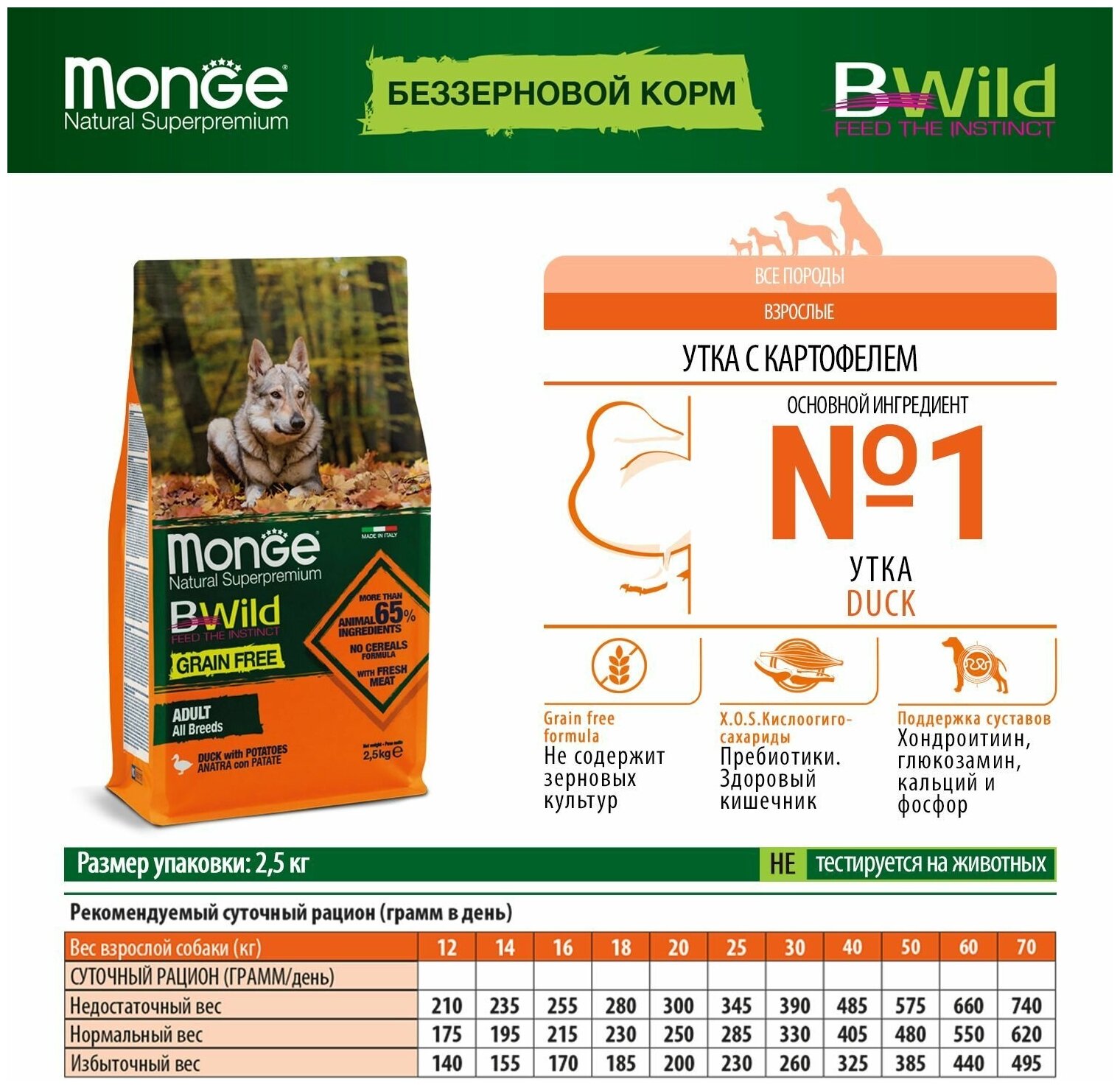 Monge Dog BWild GRAIN FREE беззерновой корм из мяса утки с картофелем для взрослых собак всех пород, 2,5 кг