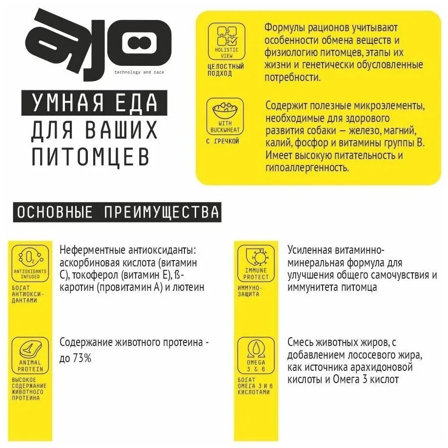 | Состав | дегидрированное мясо (индейка 18%,курица 10%,ягненок 5%), рис,жир животный,гречневая крупа, хлопья овсяные,картофель, гидролизованные мясные белки (вкусоароматическая добавка),дрожжи пивные сухие,морковь,мускатная тыква,семена льна, жир лососевый 0,8%, брокколи, экстракт юкки Шидигера, пастернак, цикорий (источник инулина), лютеин (экстракт бархатцев), экстракт зеленого чая (источник полифенолов) |