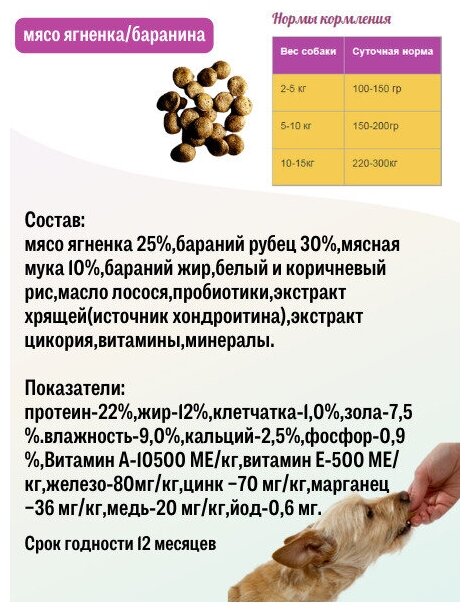 | Состав | мясо ягненка 25%,бараний рубец 30%,мясная мука 10%,бараний жир,белый и коричневый рис,масло лосося,пробиотики,экстракт хрящей(источник хондроитина),экстракт цикория,витамины,минералы |